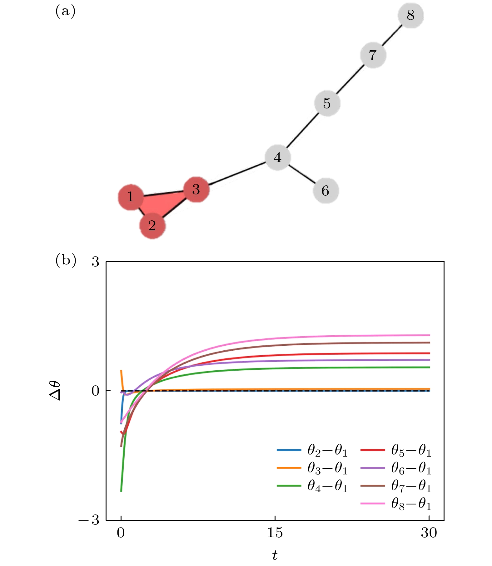 图 6  (a) 由8个节点组成的网络结构示意图, 其中包含了一个二阶单纯复形(由节点1, 2, 3组成)和8个一阶单纯复形; (b) 节点2—8与节点1之间的相位差, 其中仅有$\theta_1-\theta_2$的相位差值快速收敛至稳态值0