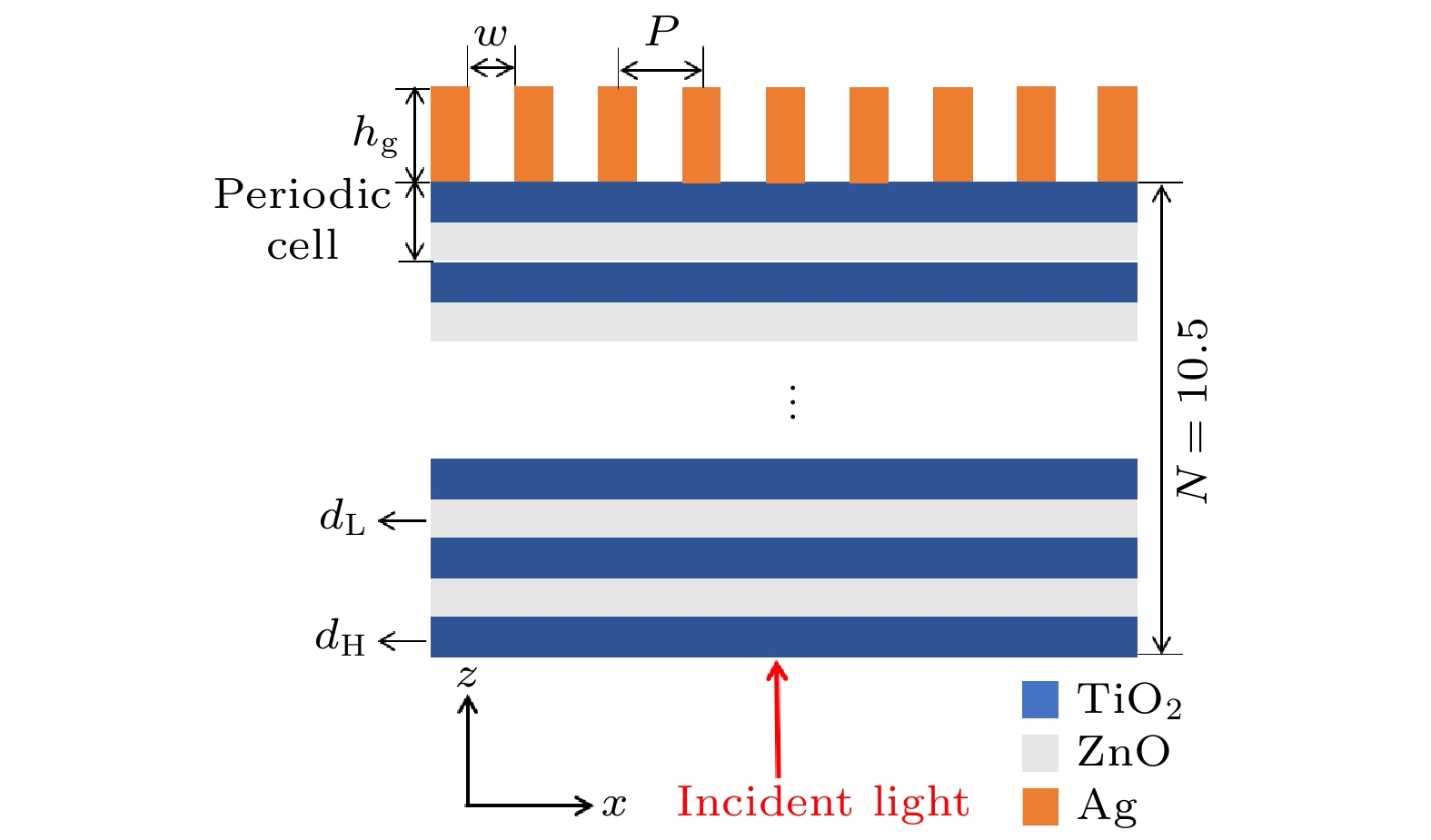 图1所示为金属光栅覆盖DBR结构的二维截面图, 图中模型在垂直纸面的y方向呈均匀分布, 且在该方向上没有对入射光场施加任何限制, 进而入射光波的衍射效应可以限制在x-z平面内讨论. 金属光栅层厚度为