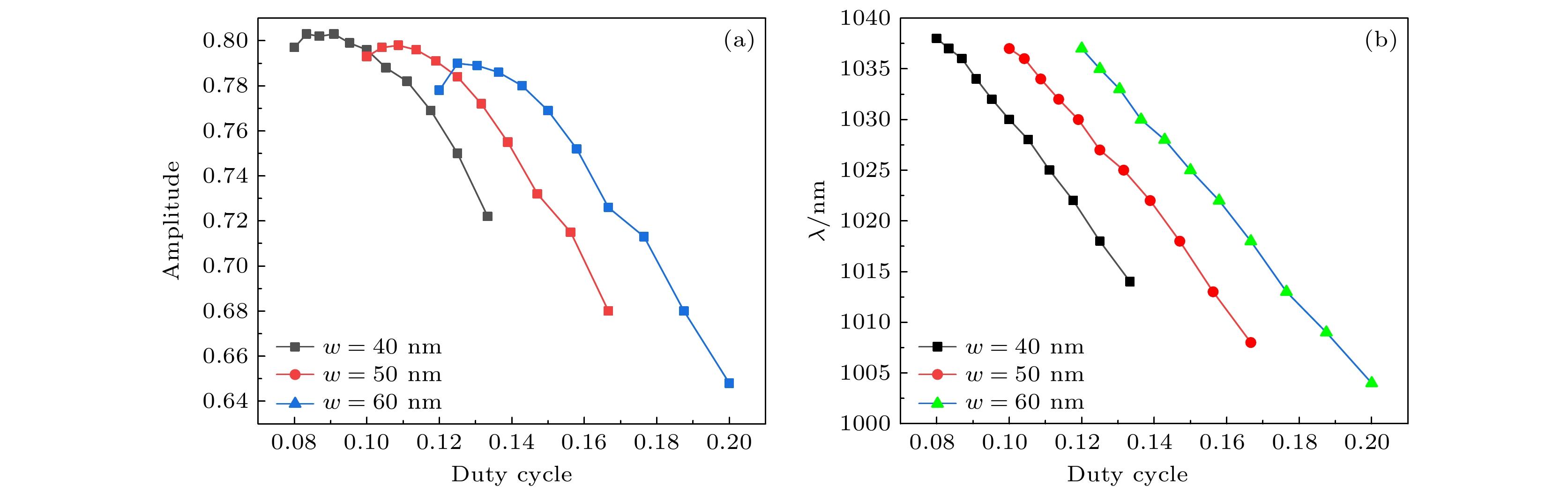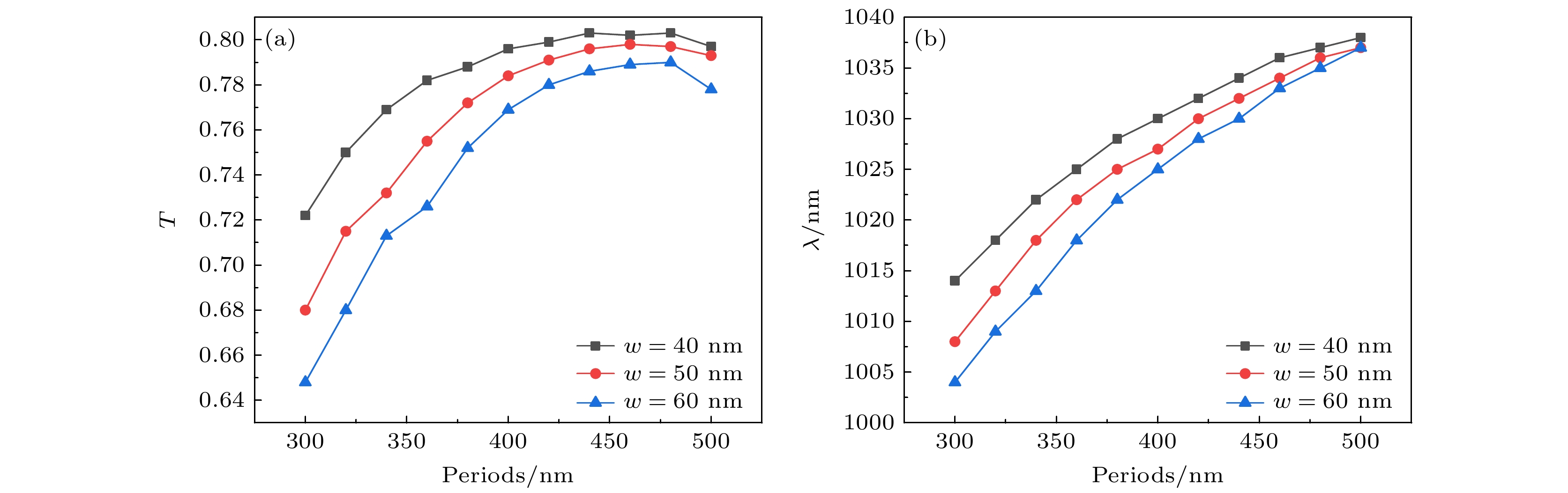 图10(b)的曲线表明在狭缝宽度给定的条件下, 透射峰中心波长会随着占空比的增大而近似线性蓝移, 这一现象表明金属光栅占空比是决定TPPs-FP混合谐振中心波长的重要因素. 同时, 在同一占空比下, 狭缝宽度越小, 透射峰的中心波长会越短. 这一现象再次表明在金属光栅覆盖DBR结构中, 异常透射峰值源于结构中TPPs-FP混合谐振模, 且这一混合谐振模式不仅依赖于光栅占空比, 而且取决于狭缝的宽度. 合理地选择这两个参数可以灵活调节异常透射峰的中心波长.
