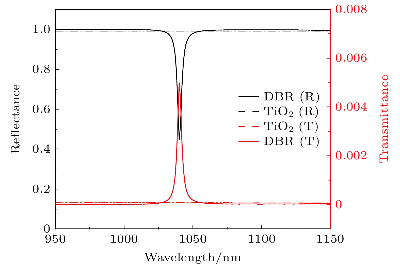 $ {h_{\text{g}}} $ , 周期p = 400 nm, 狭缝宽度记为w. 金属银的介电常数采用Drude-Lorentz模型表示[20]; 金属层下方是典型的由高低折射率材料交替分布组成的DBR结构, 其中高折射率介质为TiO2 ($ {n_{\text{H}}} $ =2.07), 其厚度$ {d_{\text{H}}} $ =121 nm; 低折射率介质为ZnO ($ {n_{\text{L}}} $ =1.6), 其厚度$ {d_{\text{L}}} $ =156 nm. 这样的参数可以确保DBR结构的禁带中心波长满足$ {\lambda _{\text{B}}}=4{n_{\text{L}}}{d_{\text{L}}} = 4{n_{\text{H}}}{d_{\text{H}}} = 1000{\text{ nm}} $ . 在DBR结构中, 一组高、低折射率介质层构成一个周期单元, 文中DBR周期数取为N =10.5, 即DBR结构两端都选用高折射率TiO2介质层. 由于x-z平面内金属覆盖DBR结构具有明显的空间周期性特征, 进而提取一个周期单元的平面模型结合周期性边界条件可以实现整个两维平面结构的模场分布及透射谱线的计算. 透射及反射功率取平均坡印亭矢量在周期单元上、下边界的曲线积分得到, 两者与入射光功率之比即为透射率及反射率值.当金属层未被刻蚀成光栅结构时, 在完整金属层覆盖DBR结构中可以产生典型的塔姆等离激元(TPPs), 实现入射光波能量在金属与DBR交界面上的高度局域. 选取完整金属层厚度为100 nm时, 该结构对TM模式入射光波产生的反射及透射谱线如图2(a)中的黑色及红色实线所示. 在波长为1040 nm处, 反射谱线存在一个典型的由TPPs引起的反射极小值, 同时透射谱线也在该波长处产生一个典型的透射峰值. 这是由于在金属-DBR界面上产生了高度局域的TPPs, 界面上的能量局域有效抑制光波的反射. 同时有部分局域的谐振能量可以穿透金属银膜的表面继续传播, 然而由于金属层对光波具有较强的吸收性, 进而100 nm厚的金属层导致峰值透射率较低. 作为比较, 图中黑色与红色虚线分别给出了将DBR结构换成均匀TiO2介质后产生的反射及透射谱线, 其反射率值在950—1150 nm的整个波段内接近于1, 透射率则接近于0, 且两条曲线保持平坦基本没有变化. 这一现象表明在金属与TiO2介质交界面上没有光场局域, 进而透射与反射都不会随波长发生变化.