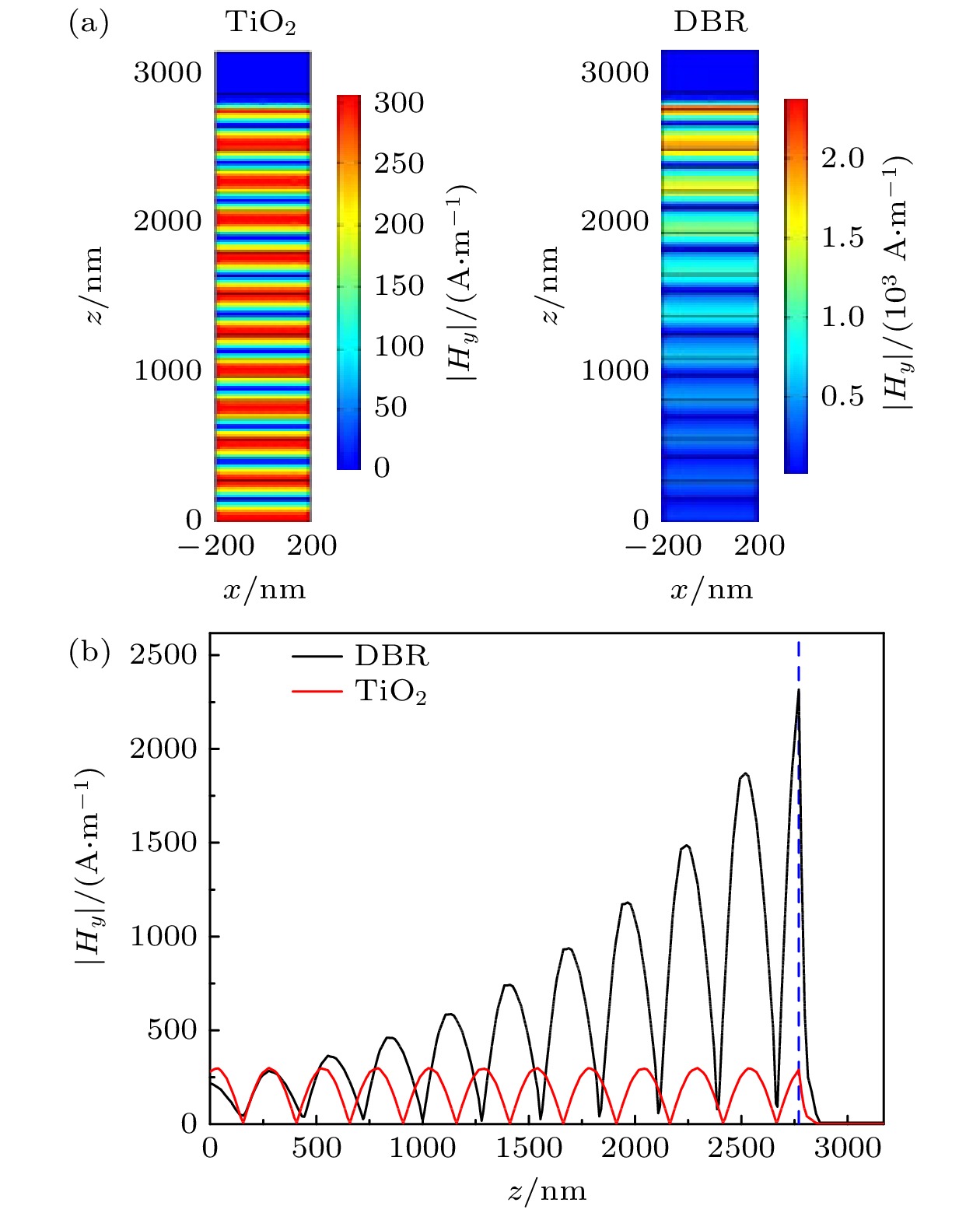 图 3 1040 nm光波入射到金属银覆盖DBR结构及金属银覆盖TIO2中的能量分布 (a) 周期单元模场分布图; (b) z轴方向磁场截线图