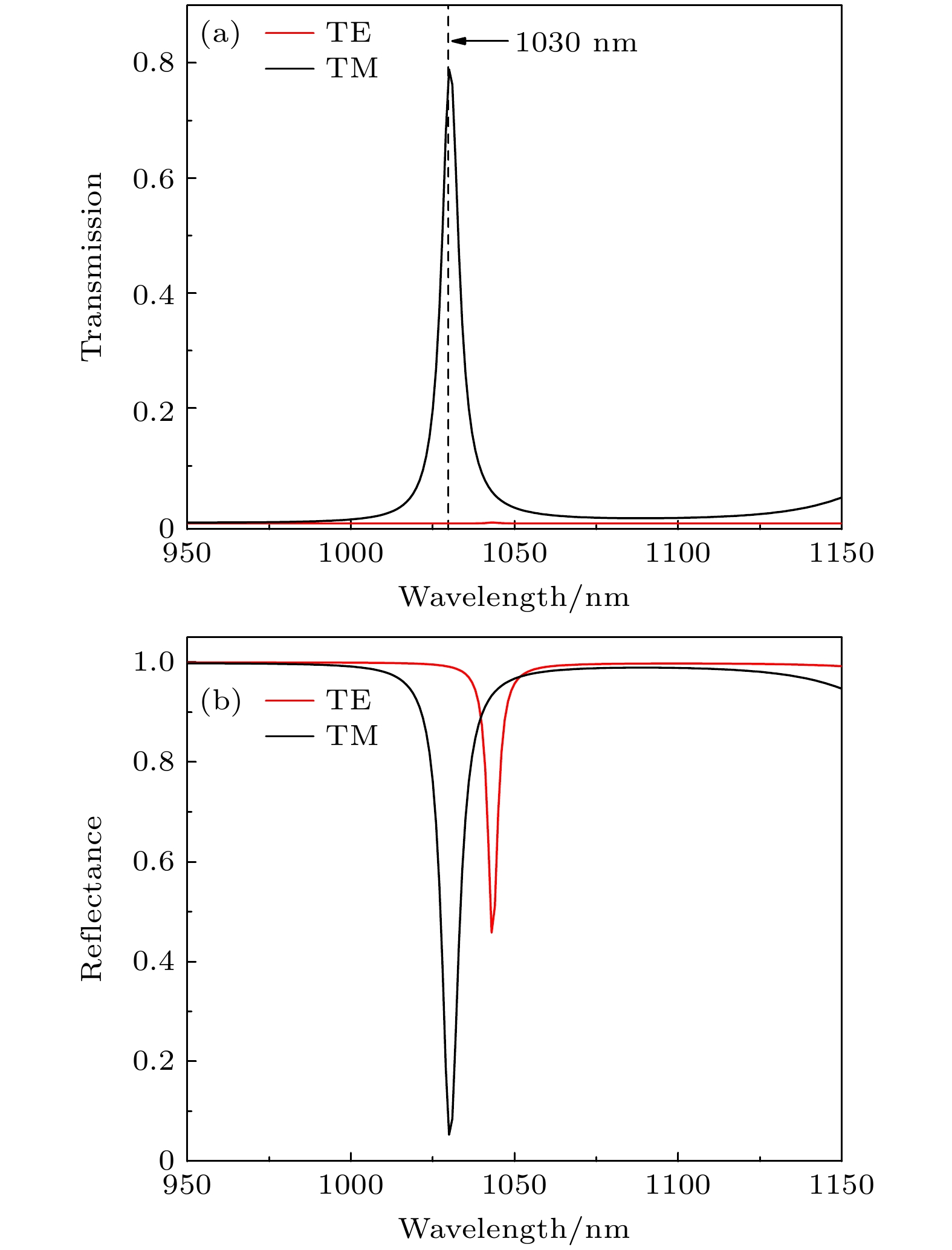 当金属层被刻蚀成如图1所示的光栅结构时, 定义光栅占空比R为狭缝区域在周期单元中的空间占比, 即R = w/p. 当金属光栅高度为130 nm, 周期p取为400 nm且狭缝宽度w取为40 nm时, TM偏振光入射, 在波长为1030 nm附近将产生一个显著的透射峰, 峰值透射率达到0.789, 如图4(a)中黑色实线所示. 图4(b)中的黑色曲线则给出了TM模式光波入射时在金属光栅覆盖DBR结构中产生的反射谱线, 反射极小值同样出现在1030 nm的波长, 显然反射极小值与透射谱峰波长一致. 与之相对, 当TE偏振光入射该结构时, 透射谱如图4(a)中红色实线所示, 在950—1150 nm的整个波段上, 透射率都接近于零. 然而图4(b)中红色曲线所描述的反射谱线却在1043 nm波长处形成了一个明显的反射极小值. 这一现象表明TE模式同样可以在金属-DBR交界面上激发TPPs, 只是TE模式激发的TPPs无法耦合进入狭缝区域产生SPPs导模, 进而不能透过金属光栅.