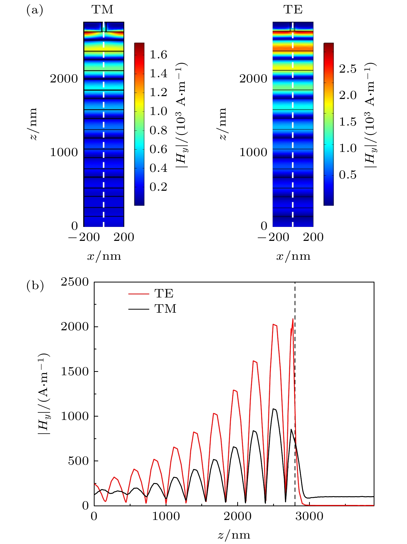 图5(a)中左右两幅插图分别给出了波长为1030 nm的TM波及波长为1043 nm的TE波入射时在金属光栅覆盖DBR结构中的磁场模式分布图. 左侧模场分布图显示透射极大值的出现可归结为TM模式的入射光波在金属-DBR交界面上激发TPPs引起光场局域, 并由TPPs作为次级波源通过端面耦合进一步激发金属狭缝内SPPs模式, 继而实现光波透射. 这里由于TPPs的光场增强有效提升了狭缝入射端口的场强, 进而提升了狭缝内SPPs的激发效率, 从而增大了光栅透射率. 此处产生的透射增强效应可以视为TPPs激发狭缝内SPPs的类FP谐振效应的结果, 这里记为TPPs-FP混合谐振. 图5(a)中右侧插图显示, TE模式入射光波同样可以在金属-DBR交界面上产生TPPs实现光场能量局域增强, 然而由于TE模式无法在金属狭缝内产生SPPs, 以致其能量无法通过亚波长宽度的金属狭缝传输形成透射, 进而产生图4(a)中接近零的红色的透射分布曲线. 图5(b)中黑色及红色曲线分别表示了TM及TE偏振入射光波在金属光栅覆盖DBR结构单元竖直中心线上的磁场模量分布, 其中黑色竖直虚线表示介质与金属光栅交界面的位置. 相比之下, 由于TE模式在狭缝区域内几乎没有能量传输, 进而TE模式在金属与DBR交界面上产生的能量局域和场强提升现象更为明显.