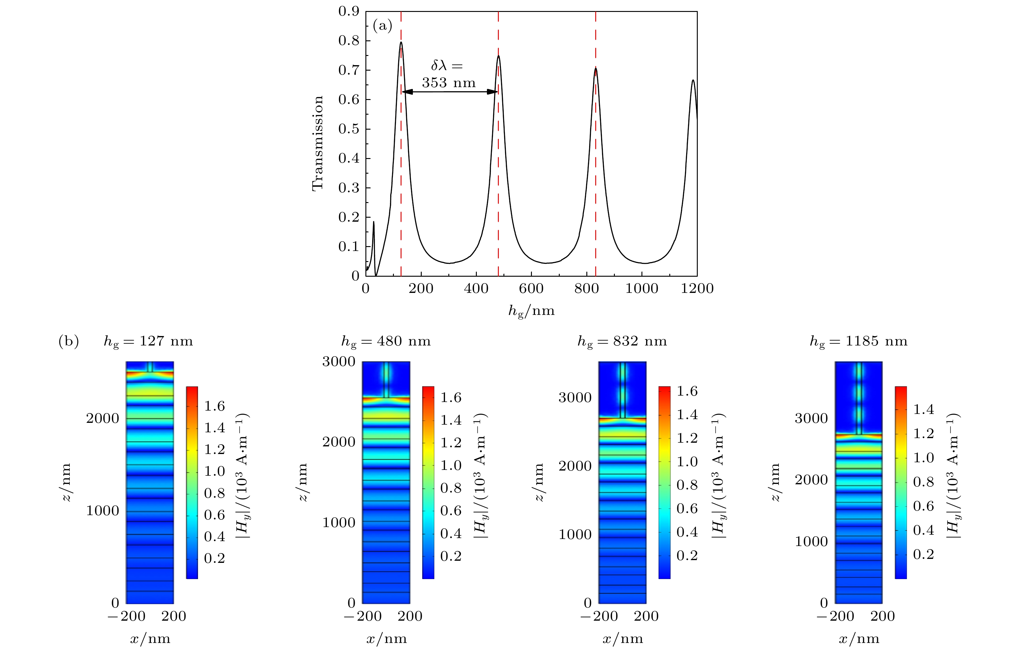为了进一步揭示透射峰的产生机理, 选取入射波长为1030 nm, 在0—1200 nm范围内以1 nm为步长对金属光栅高度进行参数化扫描, 得到透射率随光栅高度的变化曲线如图6(a)所示. 当光栅高度分别取为127, 480, 832, 1185 nm时, 在光栅覆盖DBR结构中得到了幅值单调递减的4个透射率极大值. 相邻极大值的高度间隔基本保持在353 nm, 恰为40 nm宽度的金属狭缝波导内SPPs模式波导波长的一半. 由图6(b)给出的透射峰值的模场分布可以发现, 4个透射率极大值分别对应于金属狭缝内SPPs模式的前四阶类FP谐振模式[17]. 这一现象有力揭示了光栅狭缝内的类FP谐振是产生透射增强输出的必要条件, 进而狭缝高度的取值会显著影响峰值透射率. 同时需要指出, 随着高度的增大, SPPs模式在狭缝内衰减幅度也将增大, 进而随着谐振阶次升高, 透射率的峰值逐渐降低.