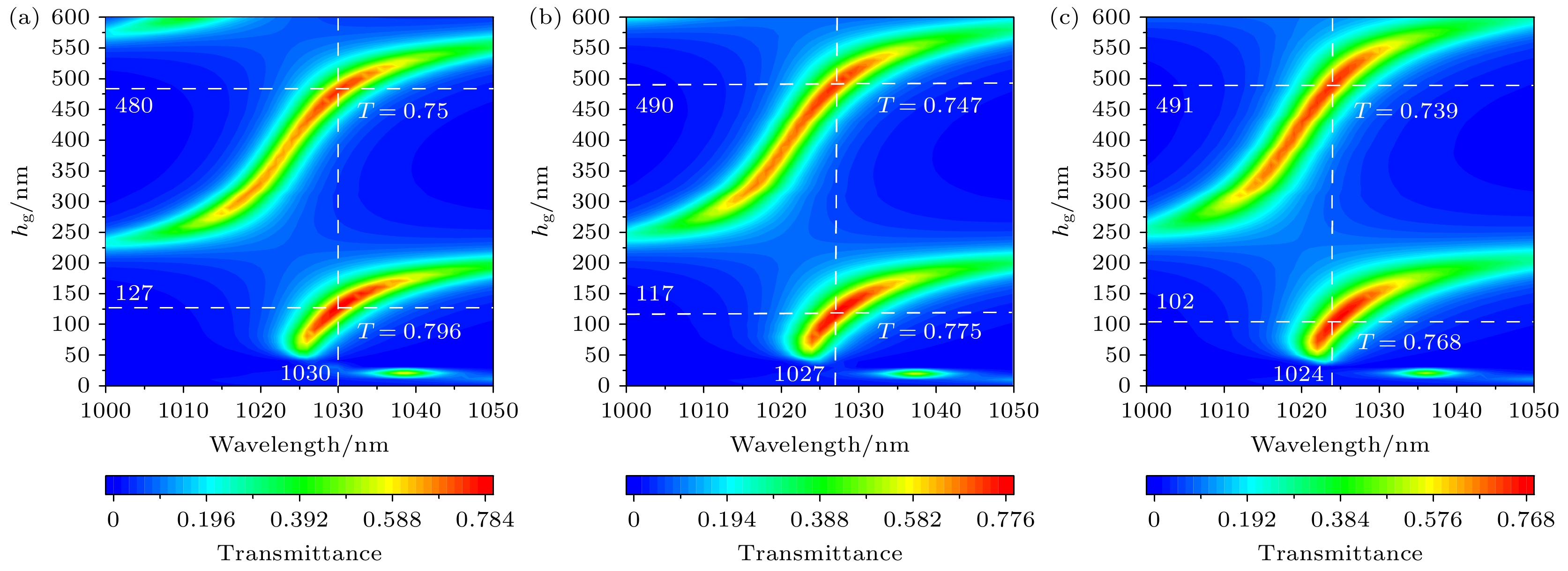 为揭示不同狭缝宽度对透射谱峰幅度及中心波长的影响, 图7(a)—(c)分别给出了狭缝宽度分别为40, 50和60 nm时, 光栅高度从0 nm增大到600 nm的过程中, 金属光栅透射谱线的演变规律. 图中透射谱峰随着狭缝高度的增大而表现出单调红移的变化趋势, 这一现象再次表明透射谱峰源于狭缝内SPPs模式的类FP谐振效应. 狭缝高度增大就意味着有效腔长增大, 进而会导致谐振波长发生红移. 图7(a)显示当光栅高度分别取为127 nm和480 nm时, 第一、二阶透射峰的中心波长均为1030 nm, 其透射率值分别为0.796和0.75, 这一结果对应于图6(a)中黑色曲线表示的前两个透射峰值. 图7(b)显示缝宽为50 nm的金属光栅当高度分别取117 nm及490 nm时, 在波长为1027 nm处得到两个透射率极大值0.775与0.747. 图7(c)显示60 nm缝宽的金属光栅当光栅高度分别取102 nm和491 nm时, 在入射波长为1024 nm处得到两个透射率极大值0.768和0.739. 上述3组结果均表明, 对于同一狭缝宽度, 一阶与二阶谐振透射峰的中心波长是一致的, 也即峰值波长由狭缝宽度唯一决定与谐振阶次无关. 此外由图5(b)可知, 两个透射极值对应的狭缝高度差正好等于SPPs波导波长的一半. 进而随着狭缝宽度的增大, SPPs模式有效折射率实部减小, 进而SPPs波导波长增大. 这一变化必然引起相邻阶次的透射峰对应的金属狭缝高度差增大. 这一现象也符合FP谐振模型的结果.