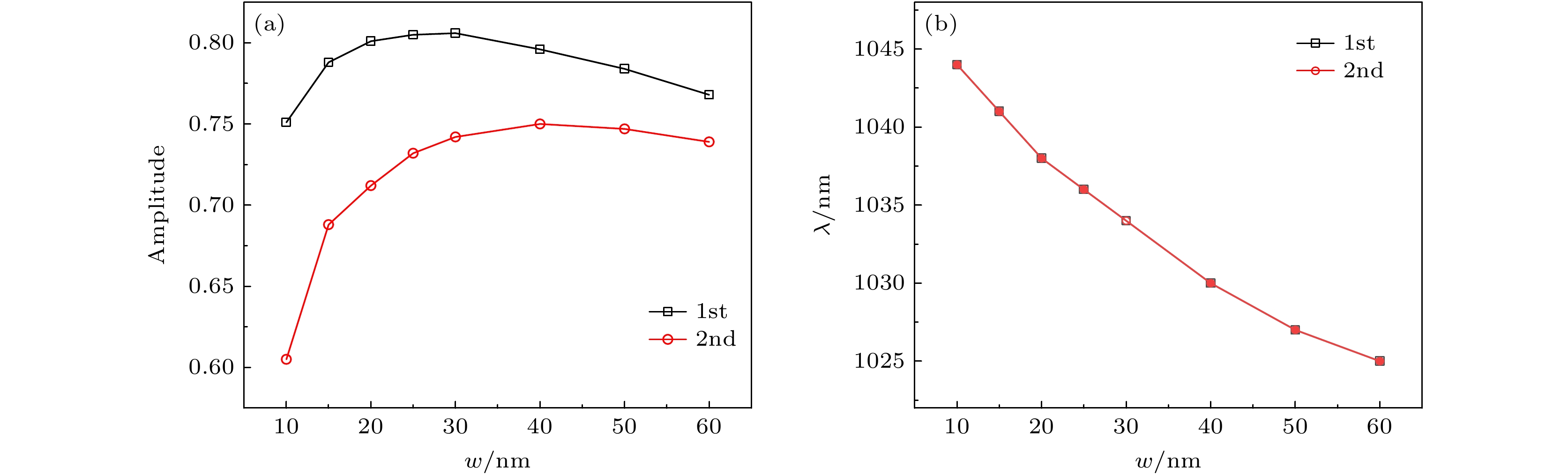 当狭缝宽度从10 nm增大到60 nm的变化过程中, 二阶谐振透射峰的峰值透射率演变趋势如图8(a)中黑色及红色曲线所示. 随着狭缝宽度的单调增大, 两峰值透射峰率均呈现先增大而后减小的变化趋势. 一阶透射峰在缝宽w = 30 nm时透射率取到了最大值0.806, 而二阶透射峰则在缝宽w = 40 nm时取到最大值0.75. 当狭缝宽度小于40 nm时, 随着缝宽的增加狭缝内部的SPPs的传输损耗会迅速降低[21], 进而导致透射峰幅度显著提升. 然而当狭缝宽度大于40 nm以后, SPPs传输损耗下降的速度将逐渐趋缓, 同时周期结构单元中金属区域宽度的占比在逐渐减小, 这会导致金属-DBR交界面上TPPs的激发效率有所下降. 这一趋势将会导致TPPs-FP混合谐振模式强度降低, 于是峰值透射率开始下降. 此外图8(a)中曲线还表明一阶与二阶谐振透射峰的峰值幅度之差会随着狭缝宽度的减小而增大, 这可以归结为较窄的狭缝具有较大的传输损耗. 与一阶模式相比, 二阶谐振模式在狭缝内的传输距离更长进而具有更高的损耗.