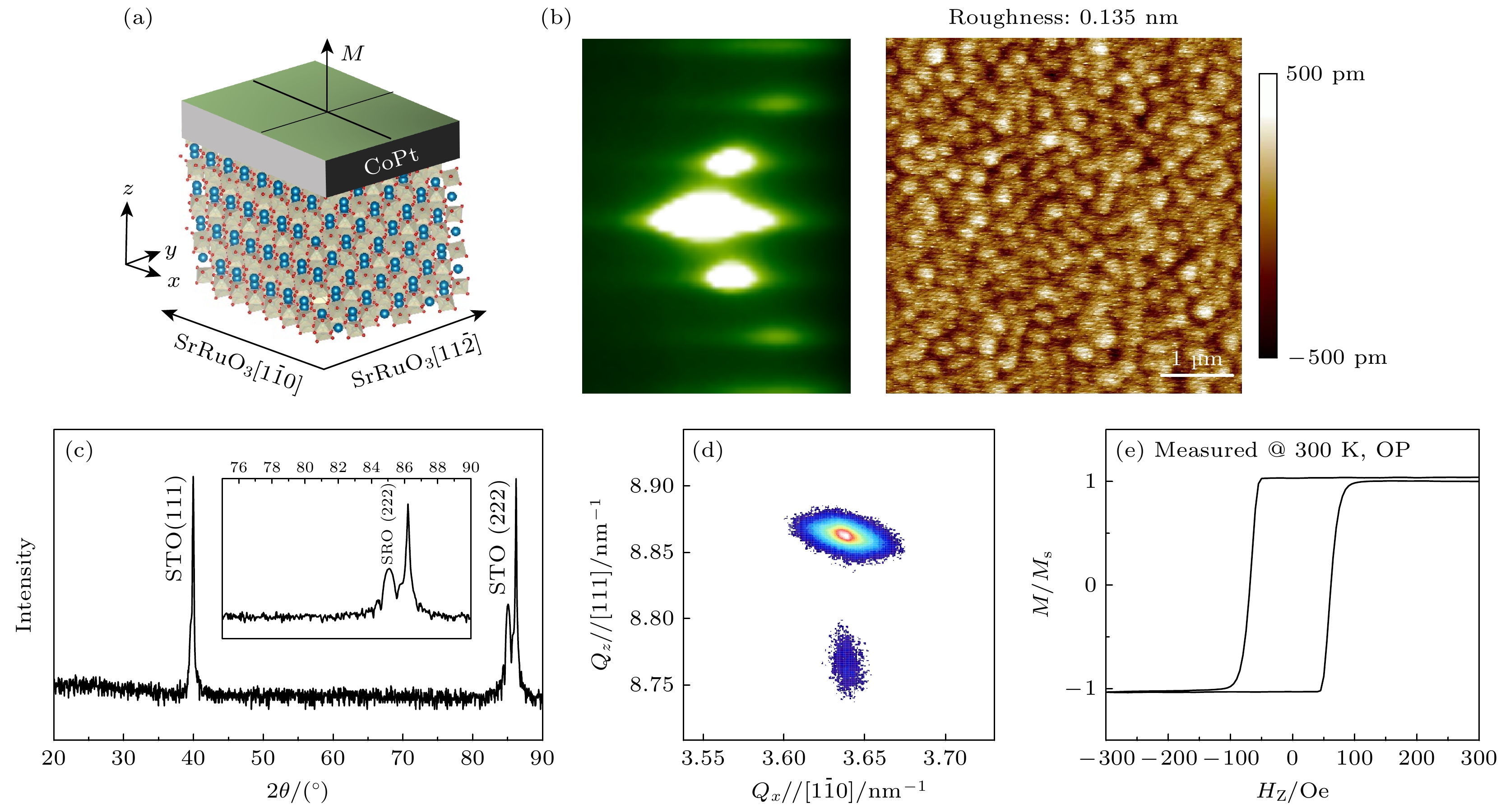 • 图 1  (111)-SRO/CoPt异质结构的表征结果 (a) SRO/CoPt薄膜异质结构示意图; (b) SRO薄膜表面的原位反射高能电子衍射(RHEED)图像及原子力显微镜(AFM)图像, 均方根粗糙度约为0.135 nm; (c) 在STO (111)衬底上生长的SRO薄膜的XRD $ \theta $-2$ \theta $ 扫描结果, 插图为SRO和STO的(222)峰附近范围的放大图; (d) SRO薄膜(132)峰附近的倒易空间映射结果; (e) CoPt的面外MOKE表征