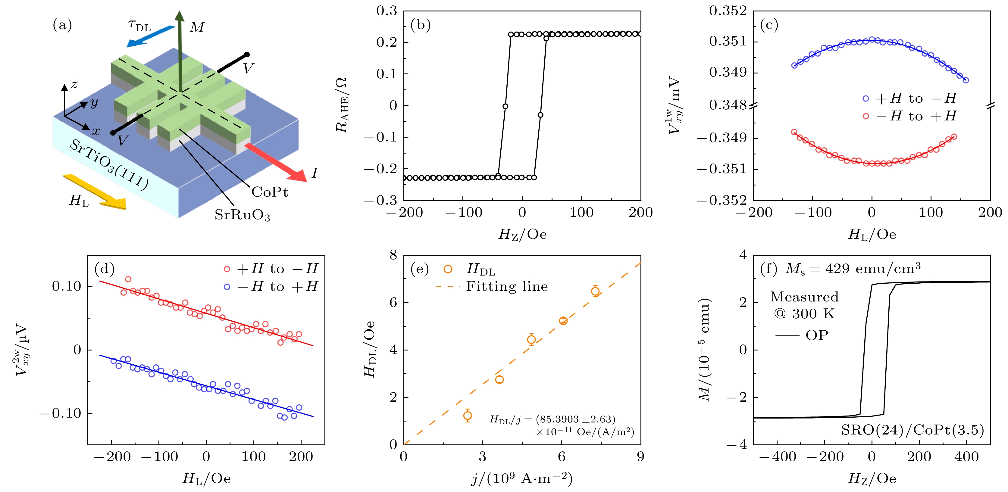 Figure 2.  Harmonic Hall voltage measurements of the SRO/CoPt sample under a longitudinal field HL. (a) Schematic diagram of the sample measurement. The AC current I is applied along the x-direction. The external magnetic field HL is applied along the x (longitudinal) direction. (b) Anomalous Hall resistance RAHE measured by applying a magnetic field HZ perpendicular to the plane. (c) First and (d) second harmonic Hall voltage signals as a function of the longitudinal field HL at I = 1.5 mA. (e) Variation of the SOT effective field HDL with the current density JSRO (current density shunted to SRO). (f) Out-of-plane SQUID measurement of SRO/CoPt at room temperature, from which the saturation magnetization Ms is obtained.