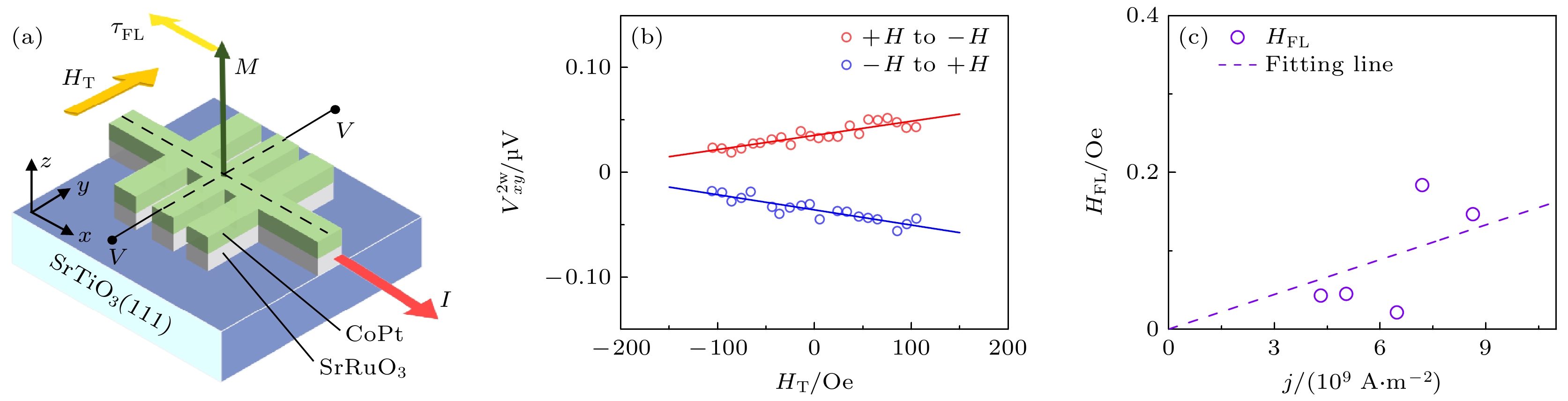 Figure 3.  Harmonic Hall voltage measurements of the SRO/CoPt sample under a transverse field HT: (a) Schematic diagram of the sample measurement, the AC current I is applied along the x-direction, the external magnetic field H is applied along the y (transverse) direction; (b) second harmonic Hall voltage signal measured under the transverse magnetic field HT at I = 2.5 mA; (c) variation of the SOT effective field HFL with the current density JSRO (current density shunted to SRO).