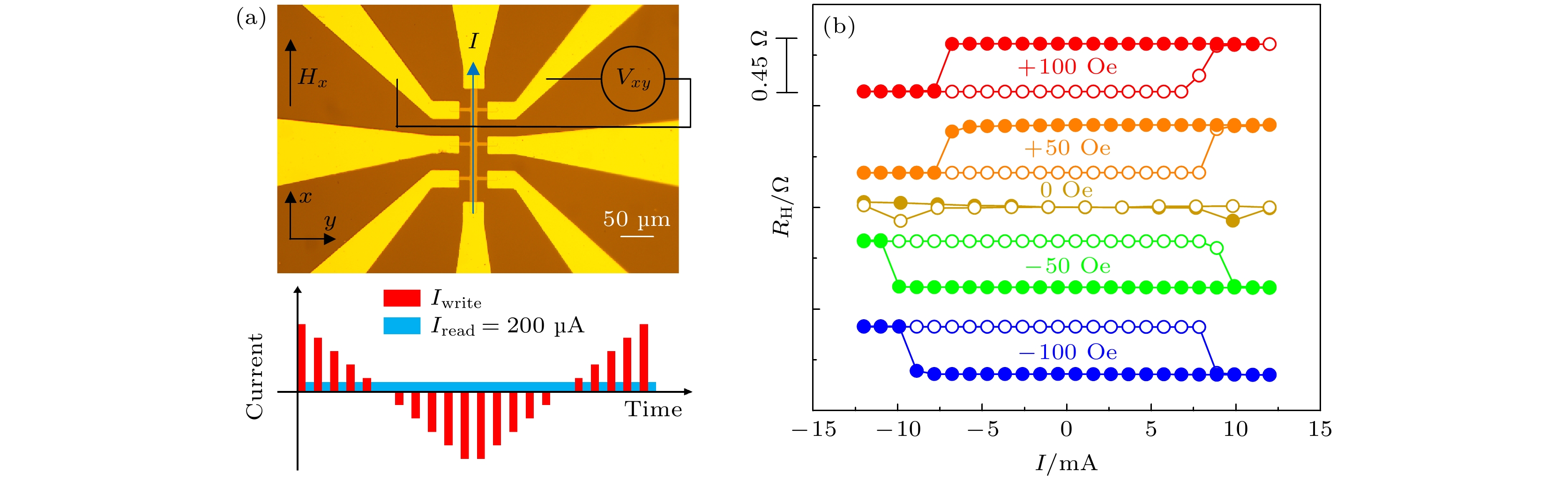 • 为了更直观地呈现SOT对磁化翻转的作用, 我们在(111)-SRO/CoPt样品中进行了电流诱导的磁化翻转测试. 图4(a)测试装置的示意图和制备好的Hall bar器件的光学显微镜照片. 如图所示, 在Hall bar器件的两端分别接入两个电流源: Keithley 6221提供脉冲写入电流Iwrite以驱动磁化翻转, Keithley 6220提供微小的直流读出电路Iread(200 μA)用以监测霍尔电阻的变化. 同时, Hall bar器件的两个电压端接入Keithley 2182A纳伏表, 用于测量霍尔电压随外加磁场和写入电流的变化.
