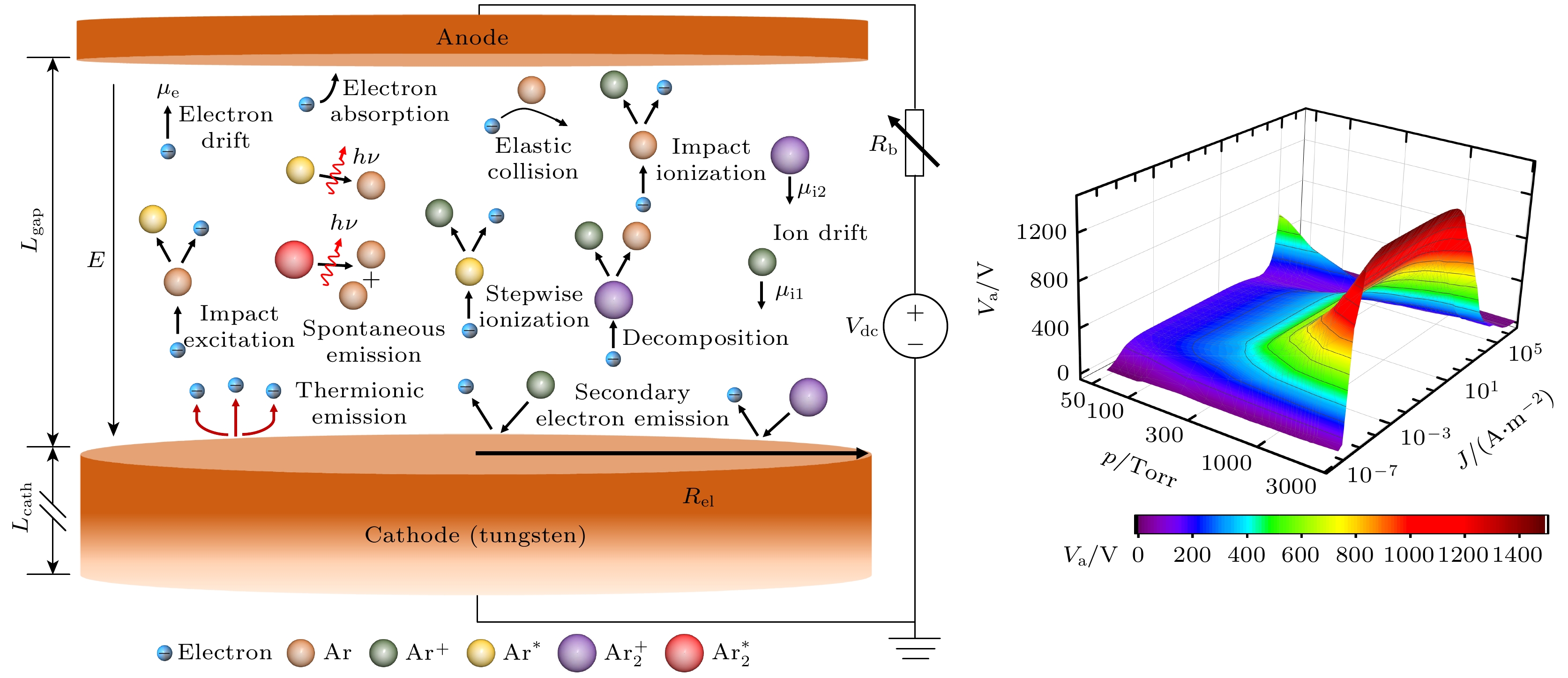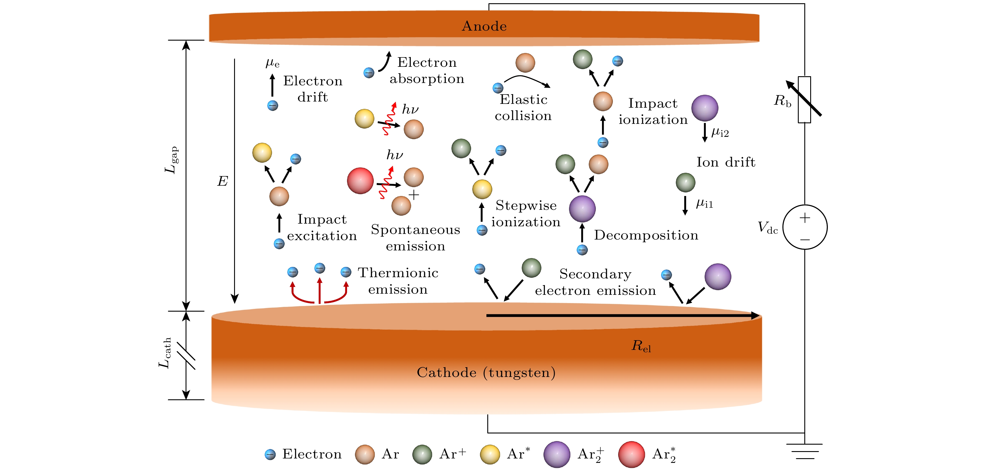 • 图 1  氩气直流微放电结构示意图. 其中, 电极间距$L_\text{gap} = 400\;{\text{μm}}$, 电极半径$R_\text{el} = 2\; {\text{mm}}$, 阴极导体材料为钨, 长度$L_\text{cath} = $$ 20 \;{\text{mm}}$