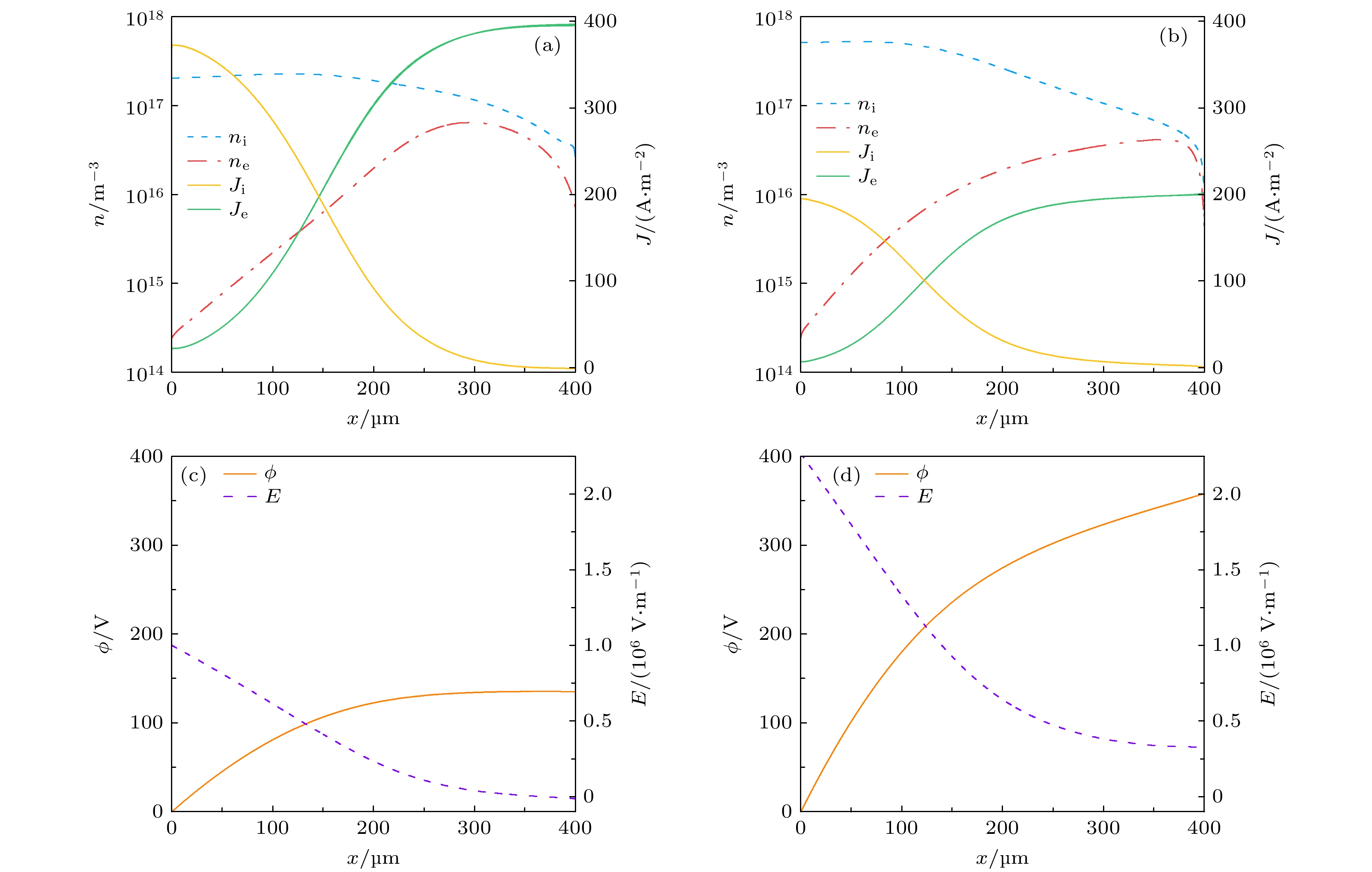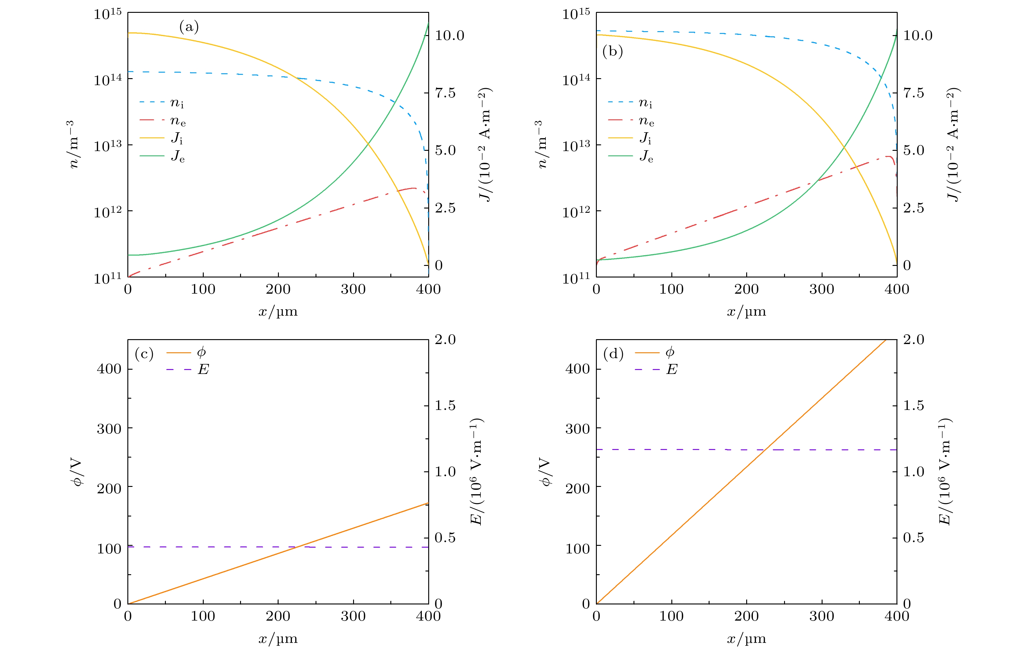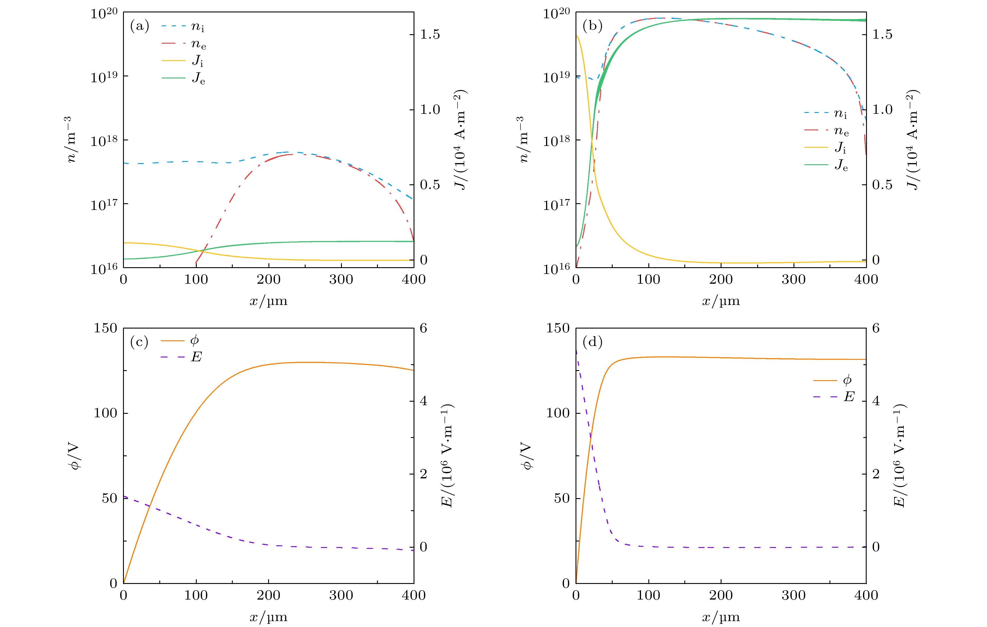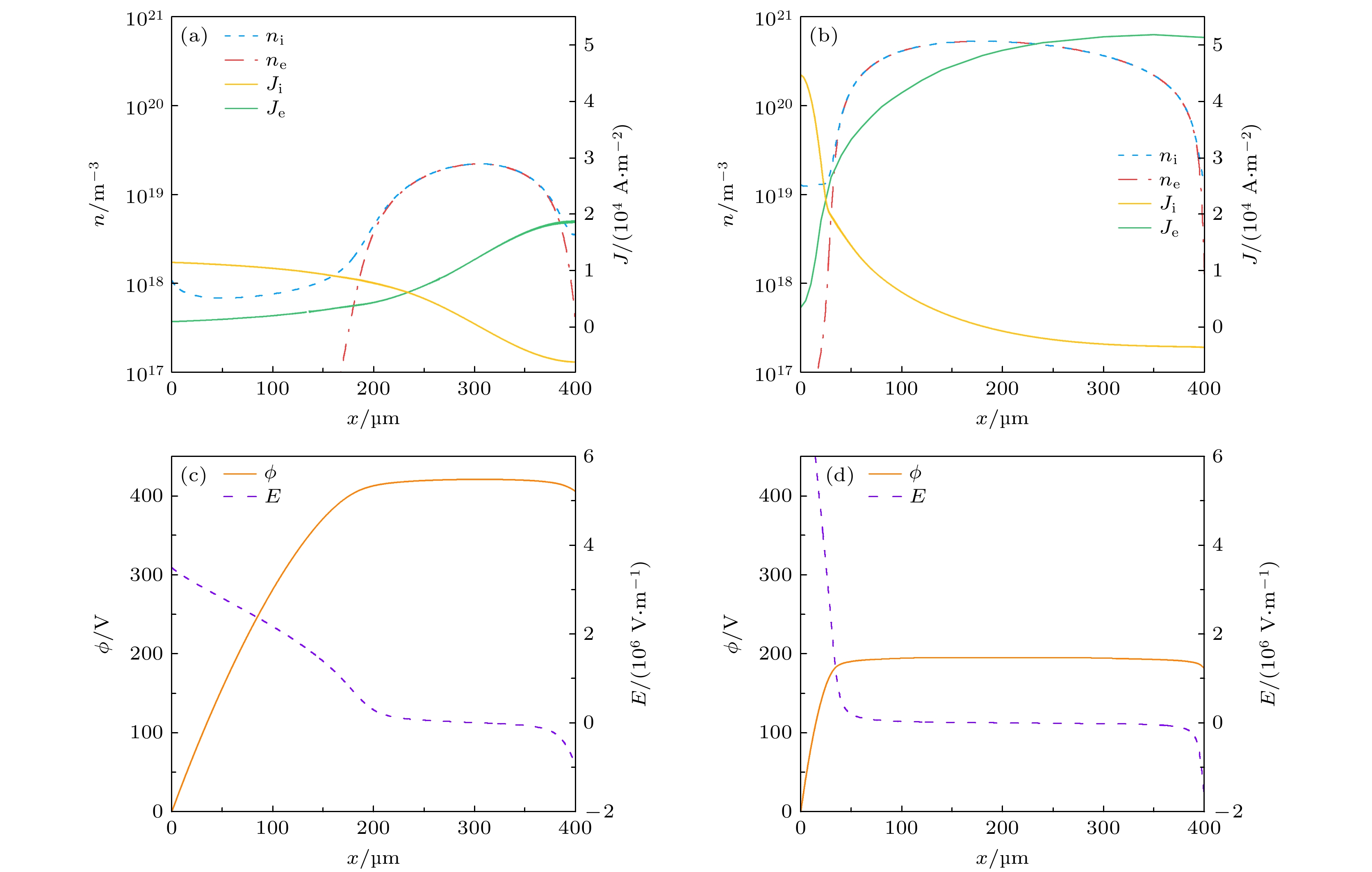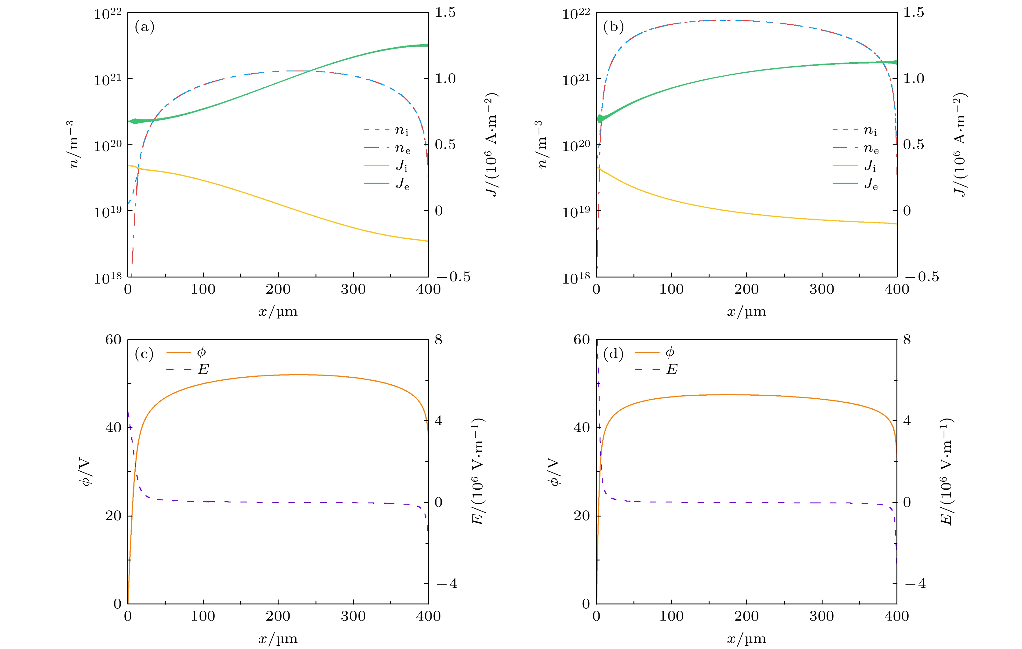 Figure 8.  Discharge characteristics in abnormal glow discharge regime. Spatial distributions of the electron density ($n_\text{e}$), ion density ($n_\text{i}$), electron current density ($J_\text{e}$), and ion current density ($J_\text{i}$) at (a) 50 Torr and (b) 500 Torr. The corresponding spatial distributions of the electric potential (ϕ) and the electric field (E) at (c) 50 Torr and (d) 500 Torr.