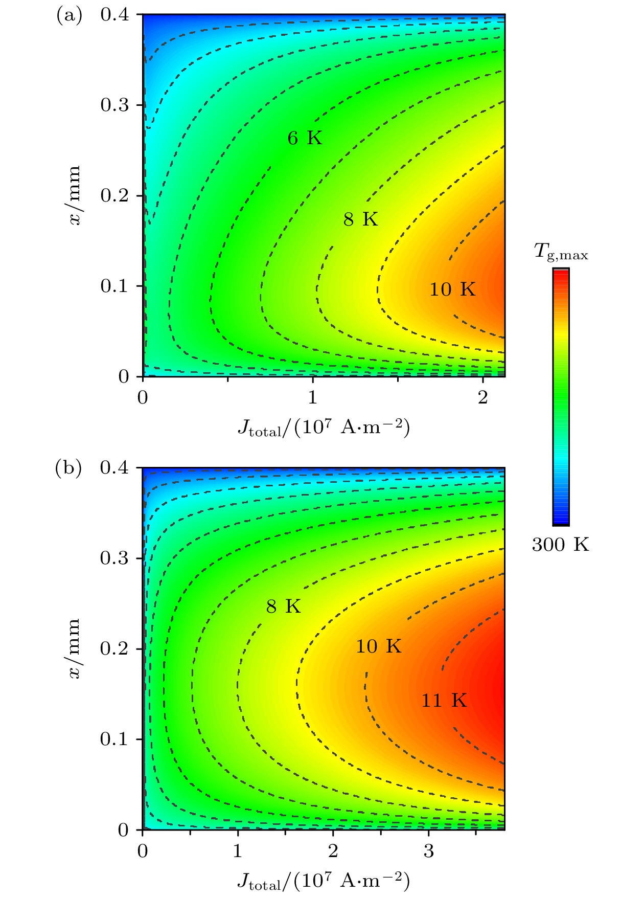 Figure 11.  Spatial distributions of discharge gap gas temperature scaling with current density at $p=$ (a) $50 \;\text{Torr}$ and (b) $500 \;\text{Torr}$. The initial temperature is 300 K. The maximum gas temperature ( $ T_\text{g,max} $ ) is 11850 K at $500 \;\text{Torr}$.