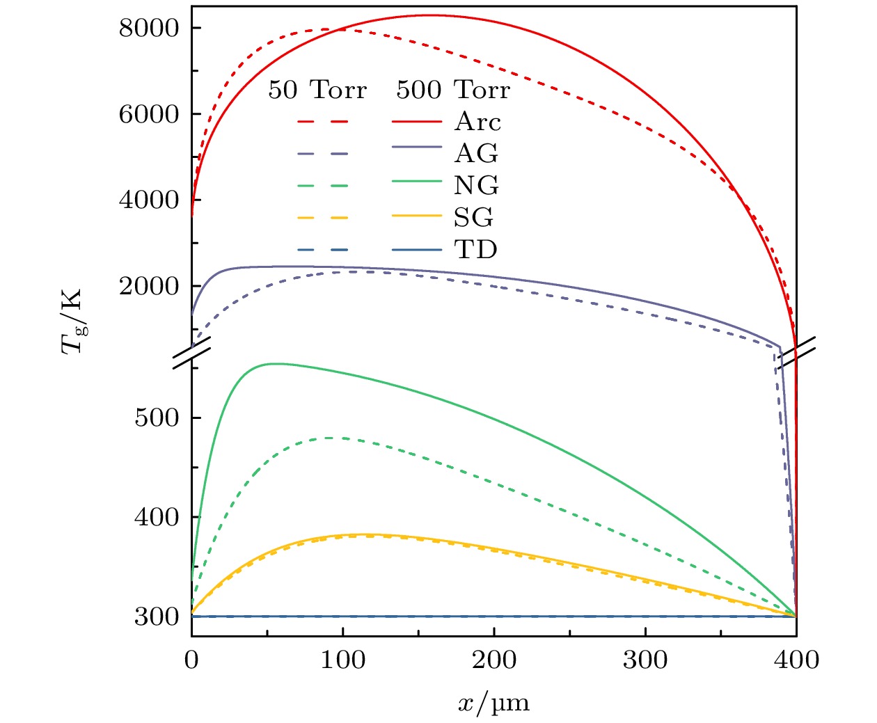 图12展现了$50 \;\text{Torr}$$500 \;\text{Torr}$两个气压条件下典型放电模式间隙气体温度的空间分布. 在汤森放电区, 两个气压下气隙温度保持$300\; \text{K}$不变, 说明此时气体加热作用可以忽略不计. 在亚正常辉光放电区, 两个气压下气体温度分布基本重合, $p_{1} = 50 \;\text{Torr}$时在$116.6\;{\text{μm}}$处出现最高温度$380.6\;\text{K}$, $p_{2} = 500 \;\text{Torr}$时在$114.6\;{\text{μm}}$处出现最高温度$382.5\;\text{K}$. 在正常辉光放电区, 气体温度上升到$500\;\text{K}$左右, 两个气压下的温度差别变得显著. $p_{1} = 50 \;\text{Torr}$时在$93.2\;{\text{μm}}$处达到最高温度$479.9\;\text{K}$, $p_{2} = 500 \;\text{Torr}$时在$56.2\;{\text{μm}}$处达到最高温度为$554.4\;\text{K}$. 随着放电电流密度的增大, 在反常辉光放电区气体温度超过$2000\;\text{K}$, $p_{1} = 50 \;\text{Torr}$时最高温度为$2330.3\;\text{K}$(对应 $109.4\;{\text{μm}}$处), $p_{2} = 500 \;\text{Torr}$时最高温度为$2453.7\;\text{K}$ (对应$66.7\;{\text{μm}}$处). 在电弧放电区, 热发射成为阴极主要的发射机制, 热电离成为空间中产生电子的主导过程, 气体温度被加热到$8000\;\text{K}$的量级. $p_{1} = 50 \;\text{Torr}$时, 气体最高温度达$7962.1\;\text{K}$ (对应$92.1\;{\text{μm}}$处), $p_{2} = 500 \;\text{Torr}$时, 气体最高温度略高, 达$8288.9\;\text{K}$(对应$157.9\;{\text{μm}}$处). 图12表明随着放电电流密度的增加, 对气体的加热作用也越来越显著, 与图11中结果一致.