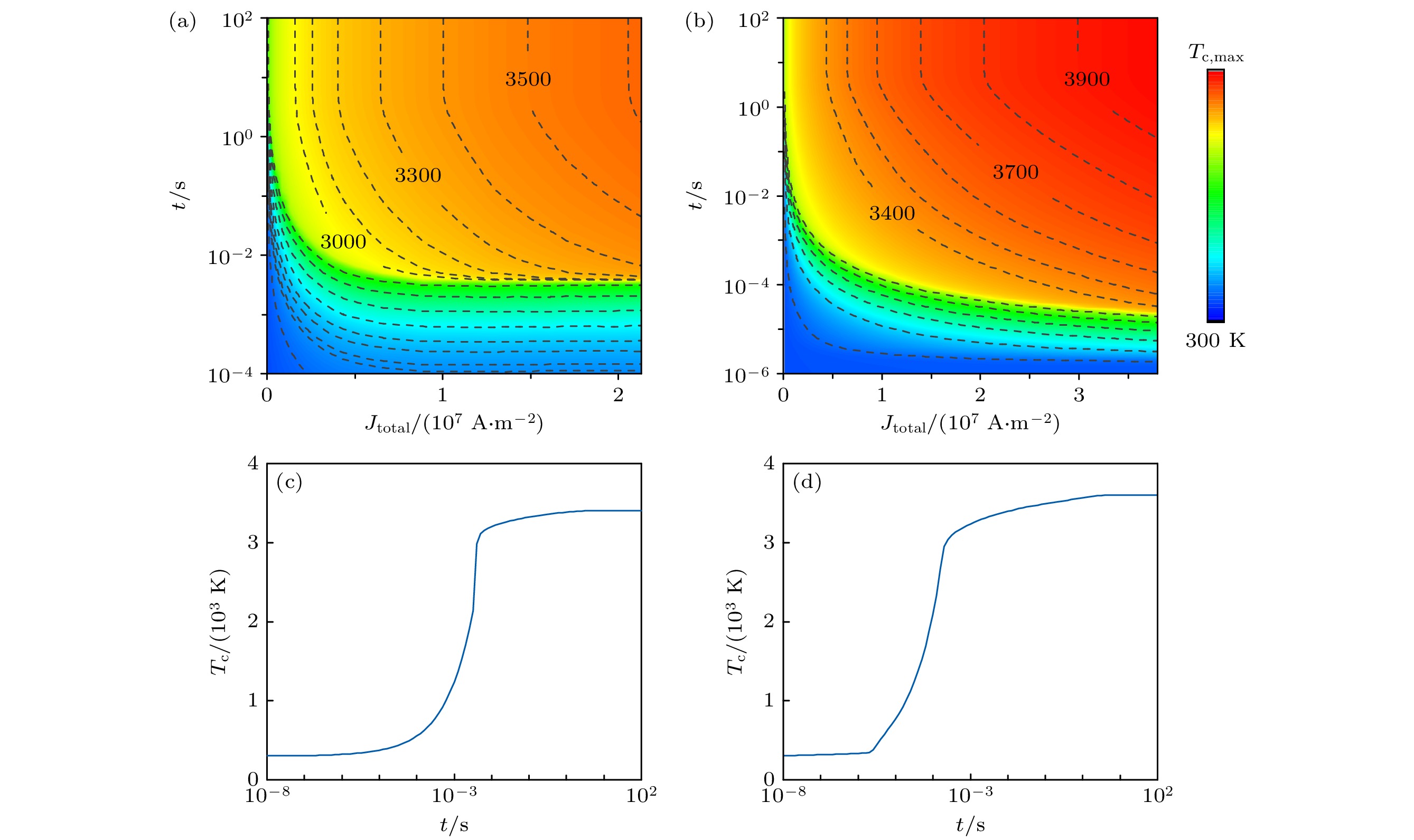 Figure 13.  Evolution of cathode surface temperature scaling with current density at (a) 50 Torr and (b) 500 Torr. The initial temperature is 300 K. The maxmium cathode surface temperature ($ T_\text{c,max}$) is 3961 K at 500 Torr. The temperature of cathode surface scaling with time when the current density is $J_\text{total} = 1 \times 10^7 \;\text{A}/\text{m}^2$ at (c) 50 Torr and (d) 500 Torr.