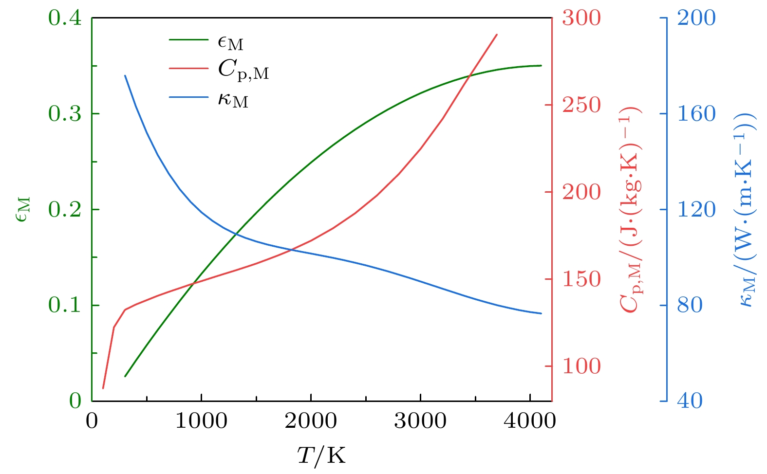 图 2  阴极材料(钨)的比热容$C_\text{p,M}$、导热率$ \kappa_\text{M} $、发射率$ \epsilon_\text{M}$随温度的变化