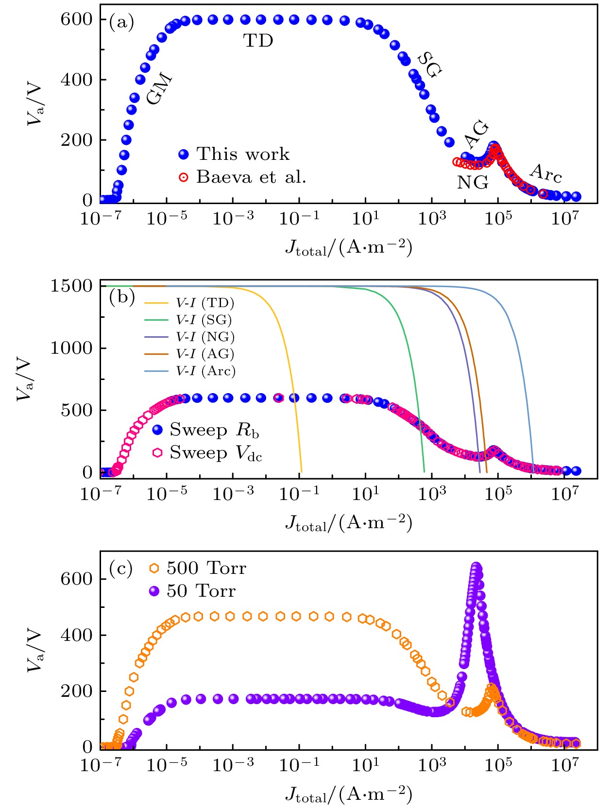 • 基于统一流体模型对高气压微放电过程进行数值模拟研究. 为验证统一流体模型的正确性, 首先与Baeva等[39,40]的研究结果进行了对比. 设置电源电压$V_\text{dc} = 1500\;\text{V}$不变, 改变镇流电阻$R_\text{b}$的阻值, 得到不同阻值下放电稳态时的气隙电压($V_\text{a}$)与放电电流密度($J_\text{total}$)之间的关系, 即CVC曲线. 图3(a)中实心蓝点为本文中统一流体模型在$p_0 = 760 \;\text{Torr} \;(1 \;\text{atm})$时仿真计算得到的CVC曲线, 随着电流密度的增大, 放电模式从最初始的盖革-米勒放电区(Geiger-Müller discharge regime, GM)向汤森放电区(Townsend discharge regime, TD)、亚正常辉光放电区(subnormal glow discharge regime, SG)、正常辉光放电区(normal glow discharge regime, NG)、反常辉光放电区(abnormal glow discharge regime, AG)转变, 并最终过渡到电弧放电区(arc discharge regime, Arc)[77,78], 涵盖了电流密度为$10^{-7}—10^{7}\;\text{A}/\text{m}^2$的大范围模拟结果, 完整包含了典型的放电模式. 该CVC曲线在正常辉光、反常辉光、电弧放电区与文献[39, 40]的结果一致, 验证了本文统一流体模型仿真结果的正确性. 在文献[3941]的基础上, 本文中统一流体模型改进了重粒子(背景气体)的能量守恒方程((20)式), 完善考虑了背景气体加热机制, 在弹性碰撞和离子的焦耳加热项的基础上, 增加了淬灭反应和复合反应引起的能量变化项. 同时改进了阴极与等离子交界处的边界条件((33)式), 考虑了阴极表面更加完整的物理过程, 增加了阴极附近气体的热流密度项对阴极加热的贡献.