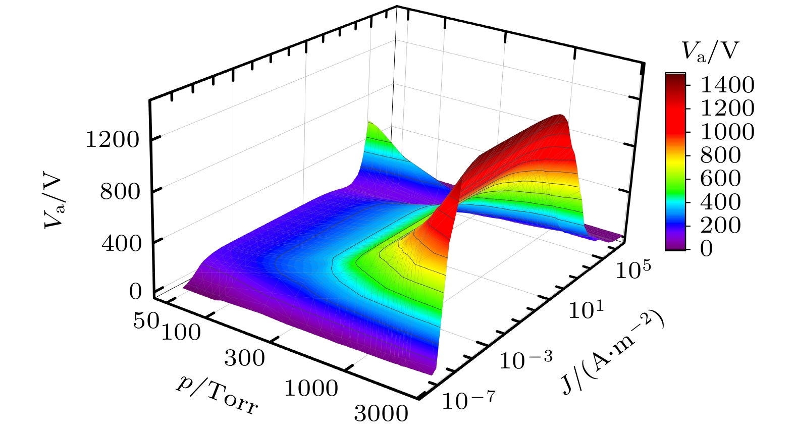 基于该统一流体模型, 计算了$V_\text{dc} = 1500\;\text{V}$时, $p_1 = 50 \;\text{Torr}$$p_2 = 500 \;\text{Torr}$两个气压条件下的放电过程, 稳态时的CVC曲线如图3(c)所示. 两个气压条件下的CVC曲线整体趋势相似, 均包含完整的放电模式. 通过对比可以发现, 在汤森放电区, $50 \;\text{Torr}$时的放电电压小于$500 \;\text{Torr}$时的放电电压, 即$V_\text{a1} < V_\text{a2}$. 汤森放电区的放电电压对应气隙的击穿电压$V_\text{b}$. 根据帕邢(Paschen)定律[79], 击穿电压是气压与间隙距离乘积($pd$)的函数, 为一条U形曲线. 本文研究条件下的$pd$值位于帕邢曲线的右半支, 当电极间距d保持不变时, 气压p升高时造成电子自由行程缩短, 电子能量积累效率低, 电离能力减弱, 因此需要更高的电压才能击穿气隙. $50 \;\text{Torr}$时的正常辉光放电电流密度小于$500 \;\text{Torr}$时的结果, 即$J_\text{total,n1} < J_\text{total,n2}$. 根据文献[80], 正常辉光放电中电极间隙的放电电流密度的估算式为