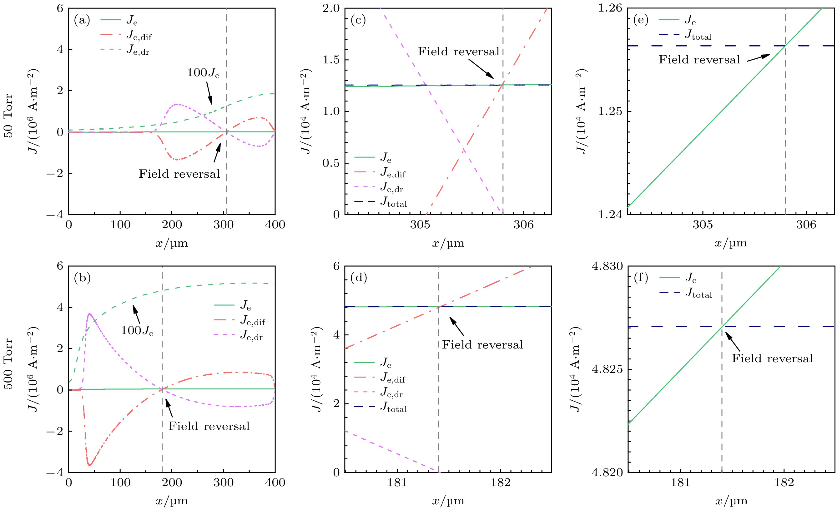 图 9  反常辉光放电区, (a) 50 Torr和(b) 500 Torr条件下电子电流密度($J_\text{e}$)、电子扩散电流密度($J_\text{e, dif}$)、电子漂移电流密度($J_\text{e, dr}$)的空间分布, 其中虚线为电场反转临界位置$x_\text{r}$; (c), (d)两个气压条件下电场反转临界位置附近的总电流密度($J_\text{total}$)与其他电流密度分量的空间分布; (e), (f)对应气压下电场反转临界位置的总电流密度与电子电流密度的空间分布