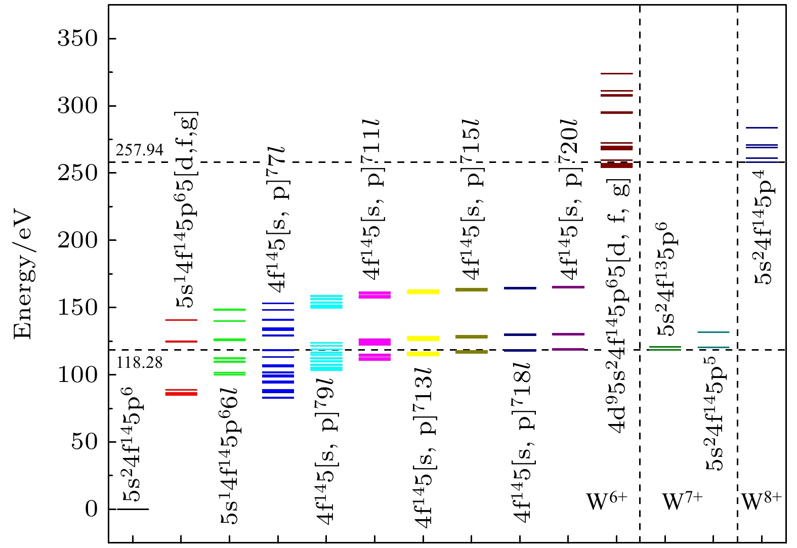 Figure 1.  Energy levels of the main configurations of W6+ , W7+and W8+ ions. Dotted horizontal lines mark the thresholds for single and double ionization of W6+.