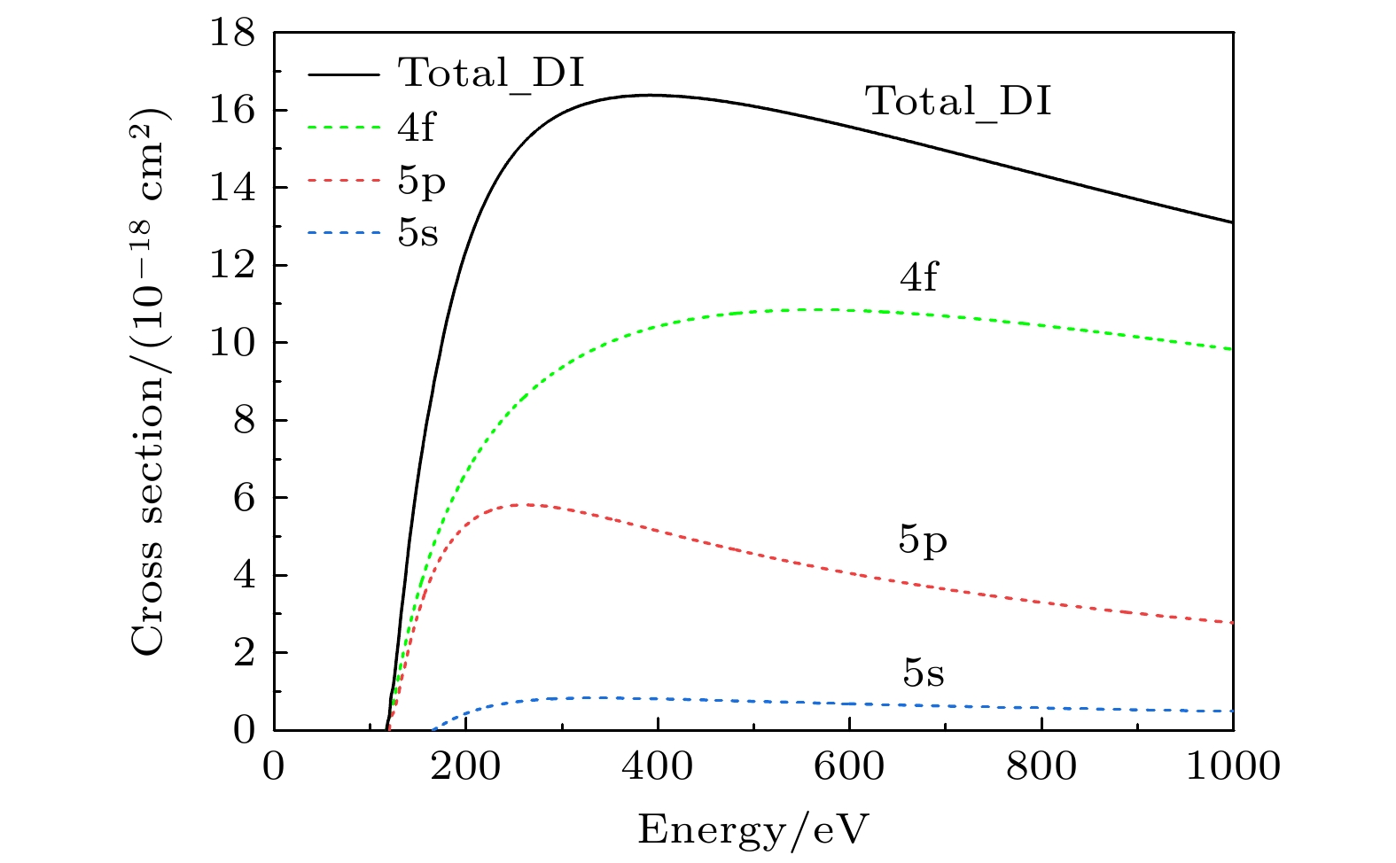 对于更深的4d和4p壳层的DI截面很小, 而且4d和4p电子被电离之后的洞态能级都高于第二电离阈值, 会进一步发生俄歇衰变且俄歇分支比接近于1, 其末态为W8+离子, 对于W6+离子的单电离截面贡献很小, 因此本文忽略了4d和4p壳层贡献.