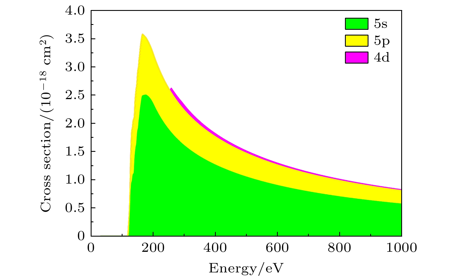 图1可知, 对于5s壳层, 当激发能从84.99 eV (5s→5d)到165.22 eV (5s→20 h), 有310个能级高于第一电离能118.28 eV, 第1个EA过程发生在124.44 eV (5s→5f). 对于5p壳层, 当激发能从37.59 eV (5p→5d)到130.38 eV (5p→20 h), 有358个能级高于第一电离能, 第1个EA过程发生在118.39 eV (5p→7 h). 对于4d壳层, 4d→5d的激发能量在254.22—272.40 eV之间共有18个能级, 其中有8个能级处于第一电离能和第二电离能之间, 有10个能级高于第二电离能257.94 eV. 当激发态能级高于第二电离阈值时, 对单电离的贡献几乎为0, 因此我们忽略了更高$ nl $的激发.