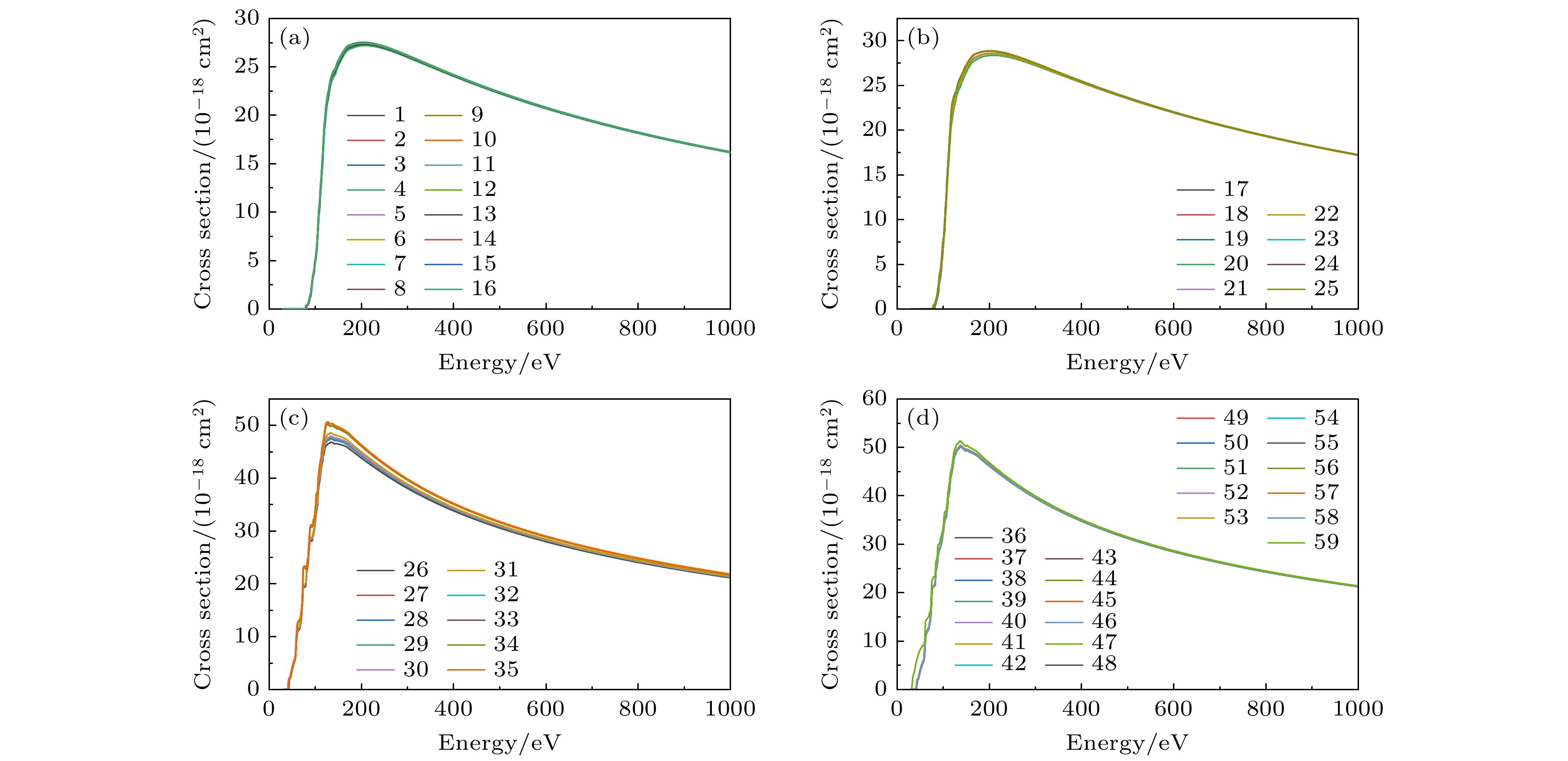 Figure 6.  EISI cross sections for the metastable levels in the configuration $ {4}{{\text{d}}^{{10}}}{5}{{\text{s}}^{2}}{4}{{\text{f}}^{{13}}}{5}{{\text{p}}^{6}}{5}{{\text{d}}^{1}} $(a), $ {\text{[Kr]4}}{{\text{d}}^{{10}}}{5}{{\text{s}}^{2}}{4}{{\text{f}}^{{14}}}{5}{{\text{p}}^{5}}{5}{{\text{d}}^1} $(b), $ {4}{{\text{d}}^{{10}}}{5}{{\text{s}}^{2}}{4}{{\text{f}}^{{14}}}{5}{{\text{p}}^{5}}{5}{{\text{f}}^{1}} $(c)和$ {4}{{\text{d}}^{{10}}}{5}{{\text{s}}^{2}}{4}{{\text{f}}^{{13}}}{5}{{\text{p}}^{6}}{5}{{\text{f}}^{1}} $ (d).