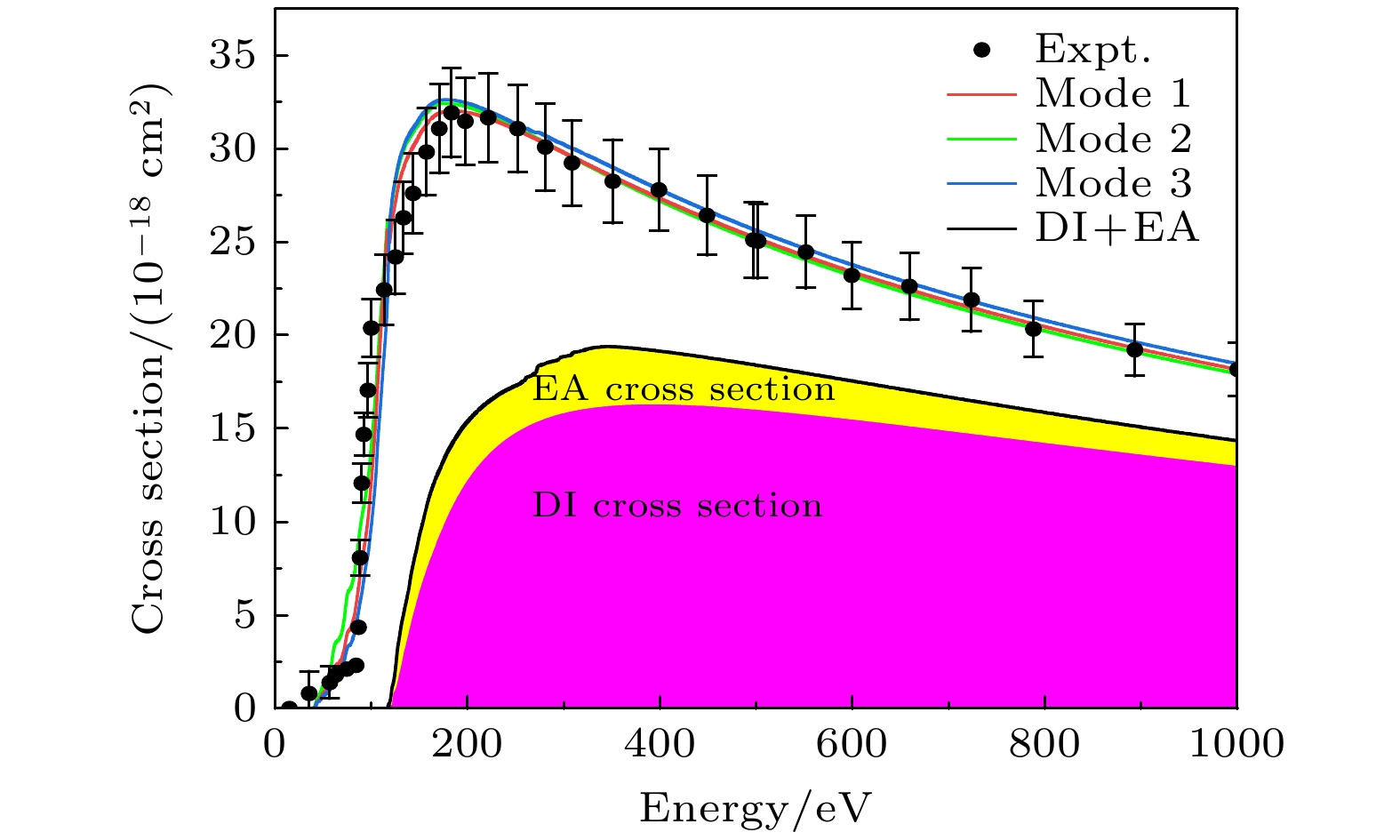 Figure 7.  Comparison of our W6+ ions fitting EISI with experiment[14]. Red, green and blue solid line respresent the results of the Model 1, Model 2 and Model 3, respectively. The black solid line is the EISI cross section of ground state $ 4{{\text{f}}^{14}}5{{\text{p}}^6} $.