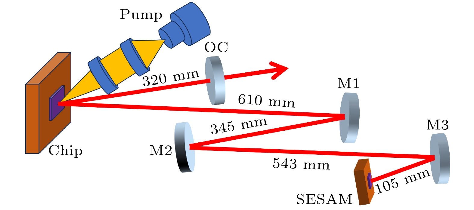 为了实现低重复频率, 利用增益芯片、SESAM、输出耦合镜(output coupler, OC)和3个高反射镜搭建了一个传统的六镜腔, 总腔长约为1.92 m, 原理图如图2所示. 芯片作为折叠镜使光能两次通过产生更大的功率输出, 芯片一端包括3个对980 nm高反射率的反射镜和SESAM, 其中M1, M2和M3的曲率半径(radius of curvature, ROC)分别为–300 mm, –200 mm, –150 mm, SESAM作为腔端反射镜之一, 它们之间的长度分别为610 mm, 345 mm, 543 mm, 105 mm. 芯片另外一端为输出耦合镜, 其曲率半径为300 mm, 对980 nm激光的透过率为3%, 与芯片距离为320 mm.