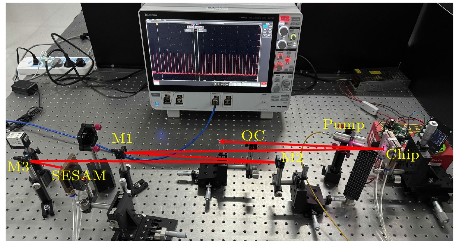 实验装置的实物图如图3所示, 除了必备的泵浦源、反射镜、输出耦合镜、SESAM和芯片之外, 还包括热电制冷器(thermoelectric cooler, TEC)温控装置、衰减片、光电探头和示波器等. 将808 nm光纤耦合半导体激光器准直聚焦在增益芯片上, 泵浦光斑直径为400 μm, 泵浦激光二极管与半导体增益芯片之间的夹角尽可能小, 以保证泵浦二极管与腔模式之间更好的模式匹配.