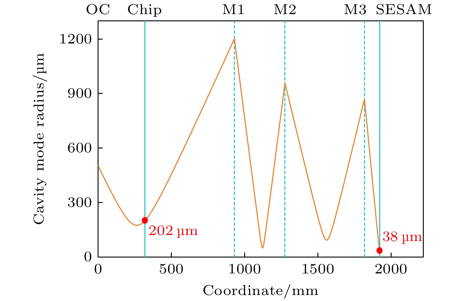 为了确立最优的锁模腔型, 对两种器件上的谐振腔模式进行了精心设计. 谐振腔内模光斑大小随位置的变化情况如图4所示. 最后增益芯片和SESAM的束腰半径分别约为200 μm和40 μm, 模式面积比约为25∶1.