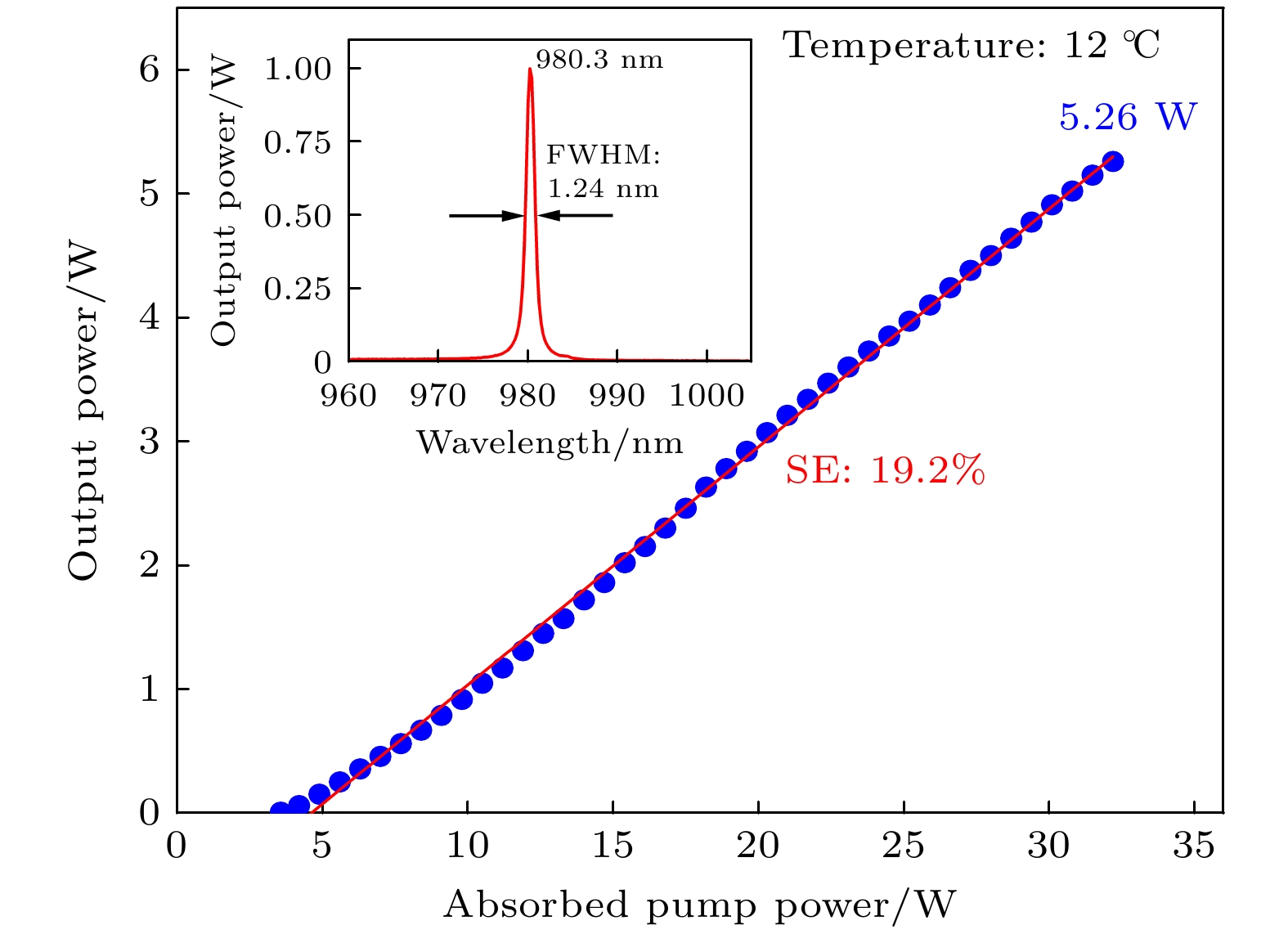 • 在实现SESAM锁模之前, 先研究了SDL连续运转的输出特性, 其输出功率如图5所示. 此时, SESAM并未发挥其启动锁模的功能, 在谐振腔中仅起到平面反射镜的作用. 由图5可知, 当吸收泵浦功率为32.2 W时, 在T = 3%的输出耦合镜下, 连续光获得最大输出功率为5.26 W, 斜效率为19.2%. 图5中的插图为连续光的光谱, 其中心波长在980.3 nm, 半高全宽(full width half maximum, FWHM)为1.24 nm.
