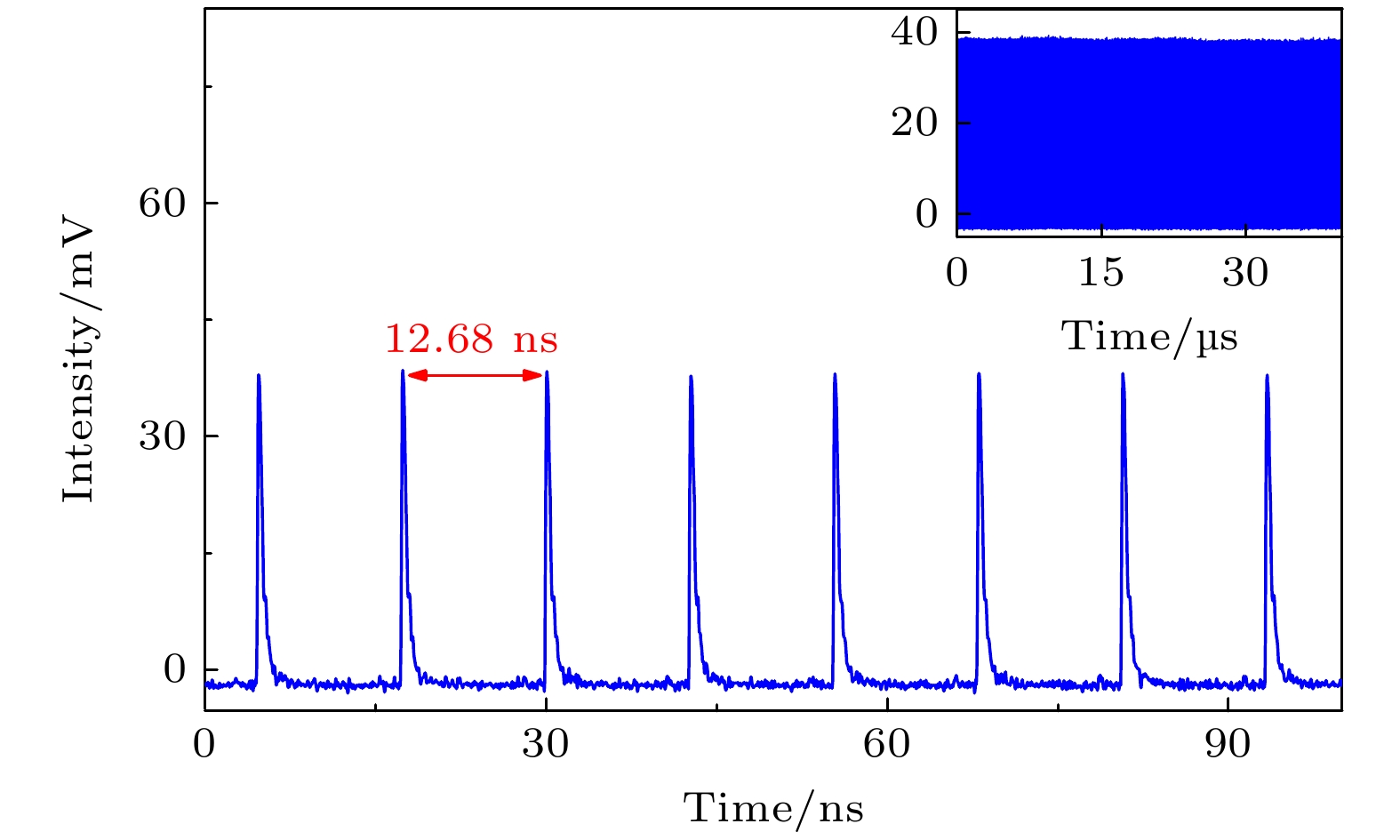 实现锁模后, 为了详细表征锁模运行的结果, 对输出激光脉冲的时域波形、射频频谱和激光光谱进行了如下表征. 如图6所示, 显示了一个基频的锁模运转, 每个腔的单脉冲往返时间为12.68 ns. 在右上角插入了一个40 μs的时域图, 表明振幅几乎一致, 没有调制包络, 证明了在40 μs的时间范围内能得到稳定的锁模脉冲.