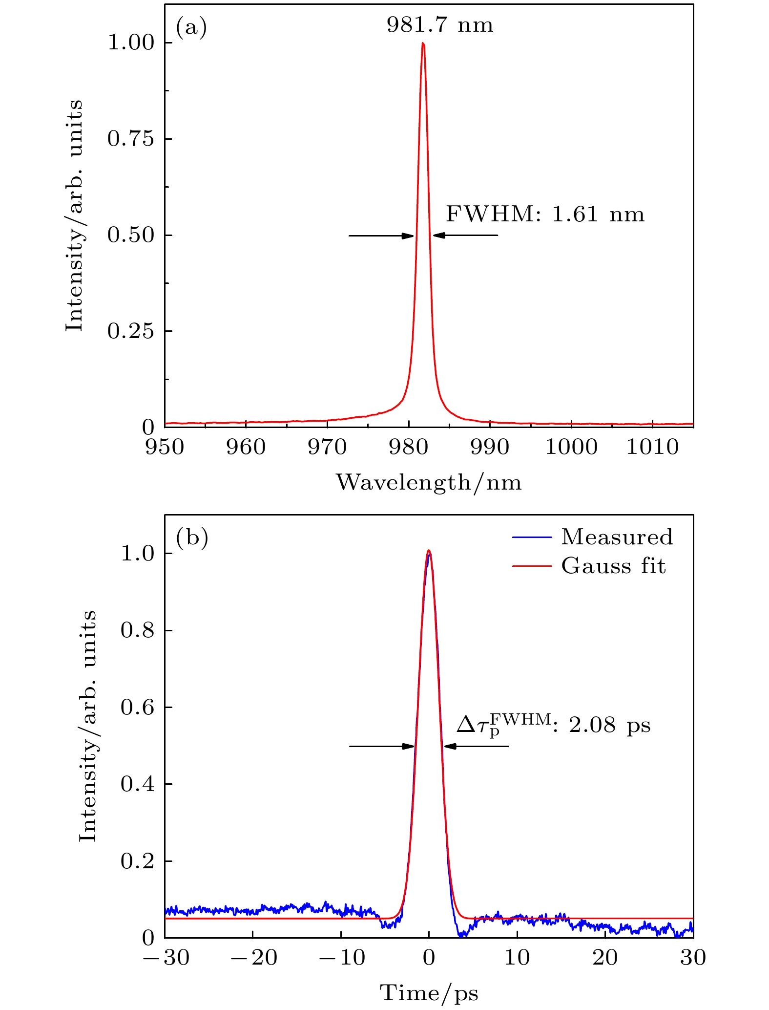 图8(a)是锁模激光的光谱, 其中心波长为981.7 nm, 对比连续光发生了一定的红移, 是由芯片的热效应导致的. 对应的FWHM为1.61 nm, 与连续光相比有一定程度的展宽. 锁模脉冲的自相关测量如图8(b) 所示. 高斯拟合的FWHM为2.08 ps. 计算得锁模脉冲的时间带宽积为1.0417, 接近理想高斯脉冲傅里叶变换极限(0.441)的约2倍.