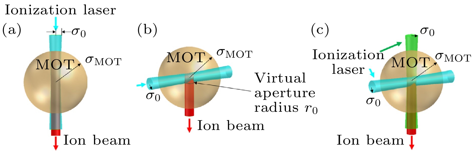 根据电离激光入射方向和种类的不同, MOTIS电离过程可分为轴向模式、横向模式和交叉双光子模式[17], 如图3所示. 在轴向电离模式和横向电离模式中, MOT的冷却光被用来作为共振激光, 同时引入一束激光聚焦在冷原子团上作为电离激光. 在交叉双光子模式中, 需要提前关闭MOT的冷却激光, 然后同时引入共振和电离两束激光交叉聚焦在冷原子云团上. 在轴向电离模式中, 电离激光沿着束流引出方向(z方向), 激光焦斑通常小于100 μm, 因此离子初始空间分布的横向(x和y方向)尺寸很小, 束流的电流密度(亮度)相对较高, 而离子束的初始纵向尺寸由冷原子云团(通常直径1 mm)决定, 引出电场会造成束流具有较大的能散. 在横向电离模式中, 电离激光引入方向与离子引出方向垂直, 离子束初始空间分布的纵向尺寸小而横向尺寸大, 因而束流的电流密度较低而能散小. 双光子交叉电离模式中, 两束激光可以从任意方向入射, 聚焦并交叉于冷原子云上, 离子初始空间分布的横向和纵向尺寸都很小, 保证了束流的能散极小, 同时避免了电离激光对MOT冷原子造成的不必要损耗. 交叉电离模式下, 需要提前关闭MOT激光, 因此只适用于脉冲工作方式的离子源. 选取MOTIS的电离模式, 需要综合考虑束流的特性要求以及整体设备的复杂度.