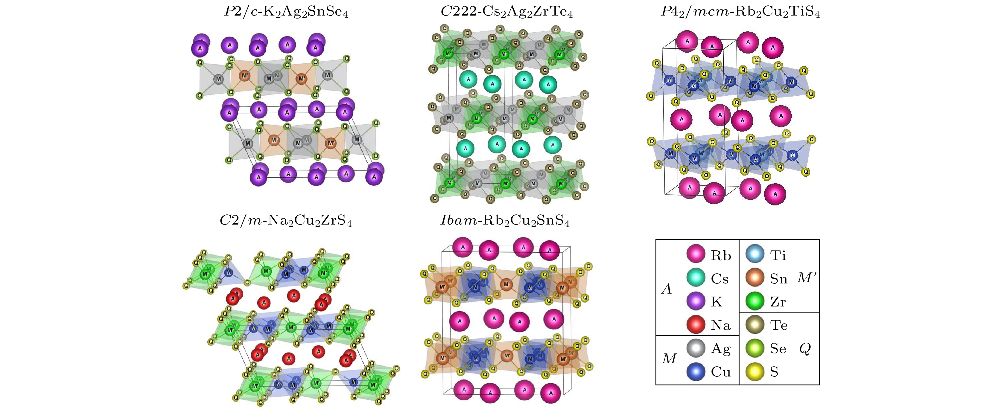 图1所示, P2/c-K2Ag2SnSe4, Ibam-Rb2Cu2SnS4, C222-Cs2Ag2ZrTe4, P42/mcm-K2Cu2TiS4C2/m-Na2Cu2ZrS4这5种具有不同空间群的化合物中, 均存在[MQ4]或[M'Q4]四面体结构单元. 然后, 我们通过对这5种已合成的材料进行同价态元素替代生成新的四元化合物: A位点用碱金属元素(Na, K, Rb, Cs)和ⅢA族元素(In, Tl)进行替换; M位点用IB族元素(Cu, Ag, Au)进行替换; M' 位点用ⅣB族元素(Ti, Zr, Hf)和ⅣA族元素(Ge, Sn)进行替换; Q位点用ⅥA族元素(S, Se, Te)进行替换. 通过该流程我们生成了1350个A2M2M'Q4四元硫族化合物, 接下来将对生成的化合物进行第一性原理计算, 筛选出最具光伏应用前景的材料.
