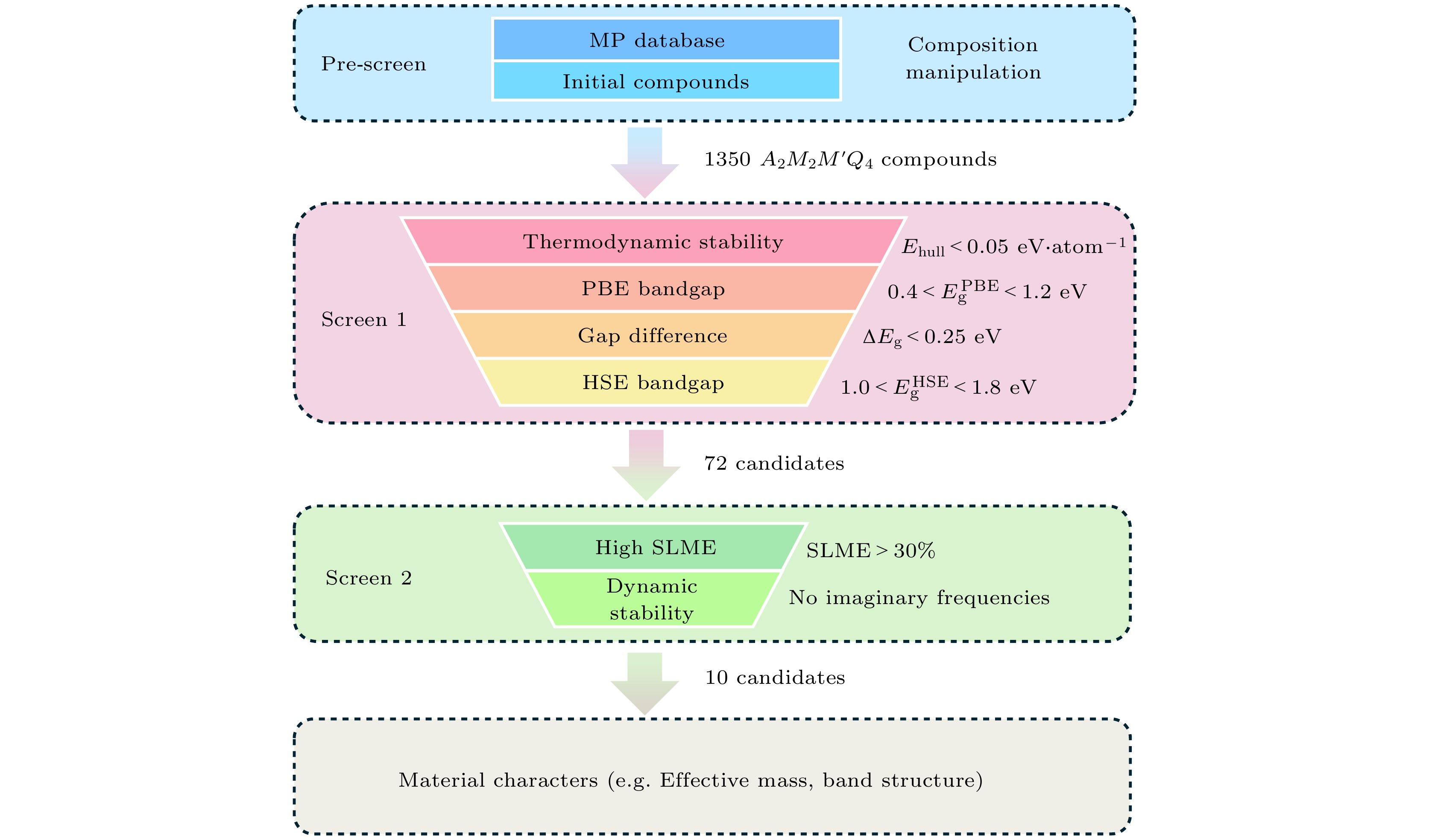 • 本工作中, 筛选新光伏材料的高通量计算工作流程如图2所示. 该流程共分为3个部分. 首先为预筛选过程(pre-screen), 该流程主要目的是通过元素取代, 构建具有合适晶体结构的A2M2M'Q4材料数据库. 从Material Project数据库[47]中获取四元硫族化合物A2M2M'Q4的初始结构, 并筛选出含有四面体结构单元的晶体结构. Material Project数据库中获得到的A2M2M'Q4材料具有9种空间群, 它们分别是: Rb2Cu2SnS4[38](空间群: Ibam, #72), K2Au2SnS4[38](空间群: ${P}\bar{1} $, #2), Cs2Au2SnS4[39](空间群: Fddd, #70), K2Ag2SnTe4[40] (空间群: $ {I}{4}2{m} $, #121), K2Ag2SnSe4[41] (空间群: P2/c, #13), Rb2Ag2GeS4[42] (空间群: C2/c, #15), Cs2Ag2ZrTe4[44] (空间群: C222, #21), Na2Cu2ZrS4[43](空间群: C2/m, #12), K2Cu2TiS4[45] (空间群: P42/mcm, #132).
