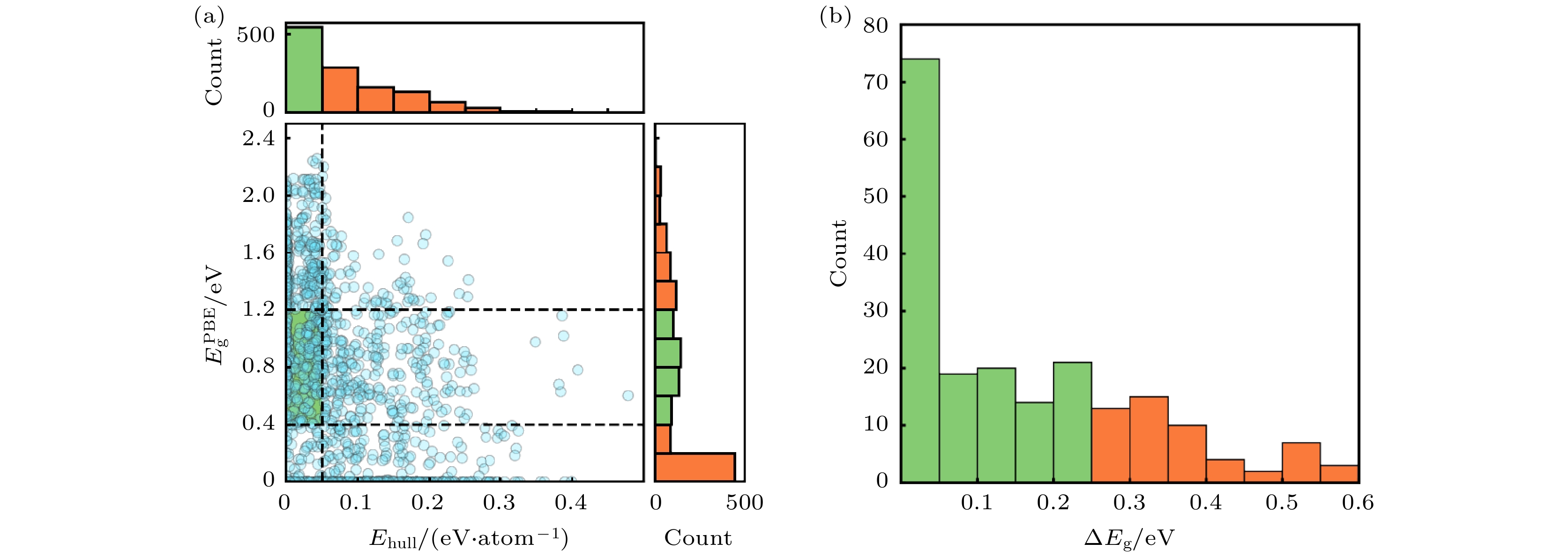 图 3  (a) 1350种A2M2M'Q4化合物的Ehull$ {{E}}_{\text{g}}^{\text{PBE}} $的散点图和直方图; (b) 202种化合物的ΔEg直方图