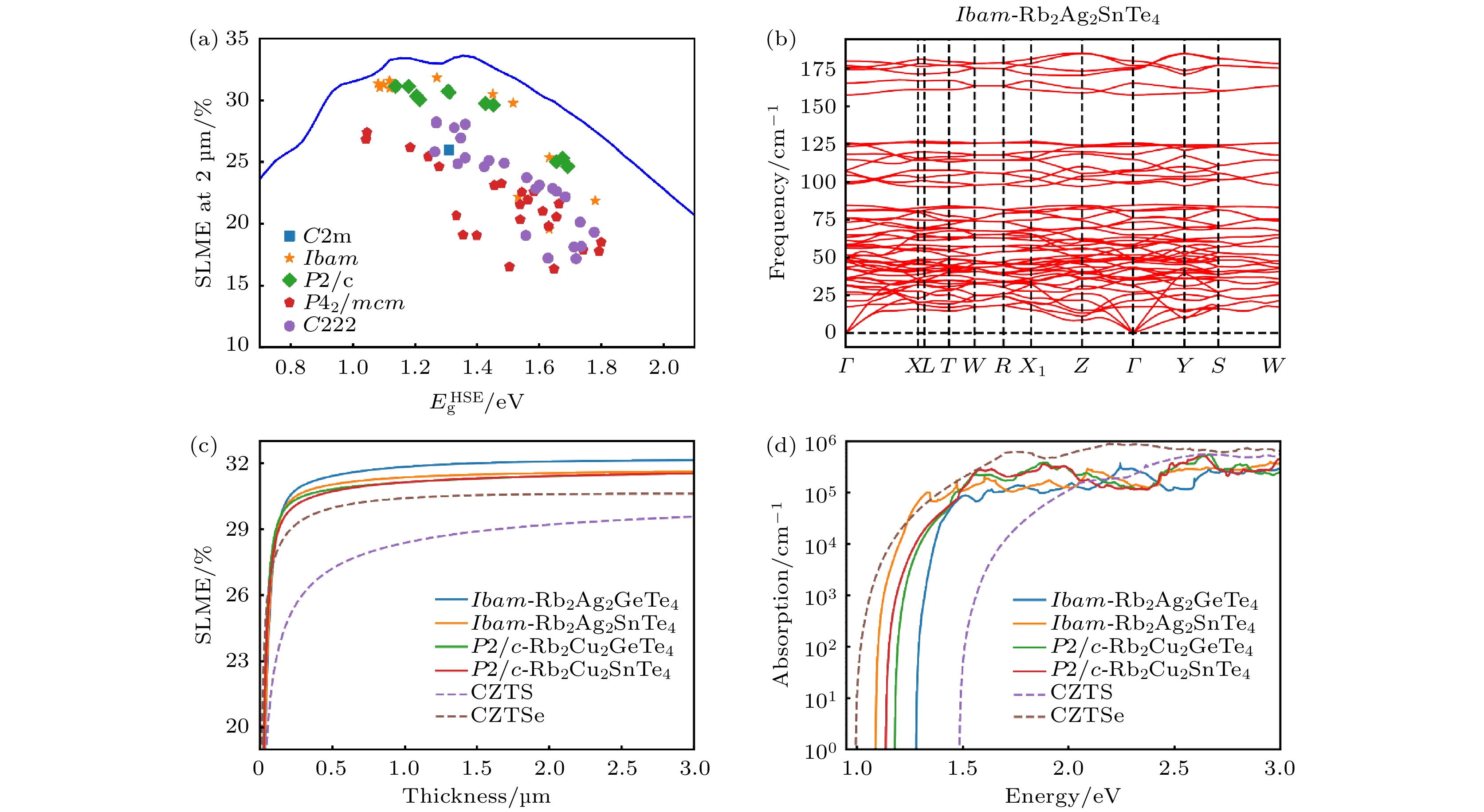 图 4  (a) 72种化合物在薄膜厚度为2 μm时的SLME与$ {{E}}_{\text{g}}^{\text{HSE}} $的关系图, 蓝线为Shockley-Queisser极限; (b) Ibam-Rb2Ag2SnTe4的声子色散谱; 4种SLME超过31%的候选材料, CZTS和CZTSe的(c) SLME与薄膜厚度的关系和(d) 光吸收系数