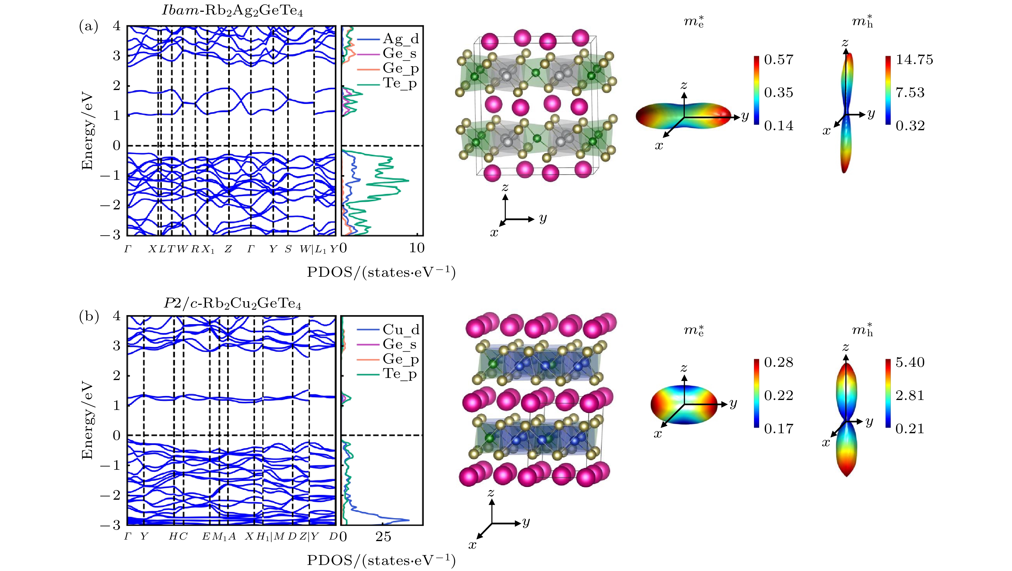 图 5  (a) Ibam-Rb2Ag2GeTe4; (b) P2/c-Rb2Cu2GeTe4的能带结构、分态密度、晶体结构和载流子有效质量