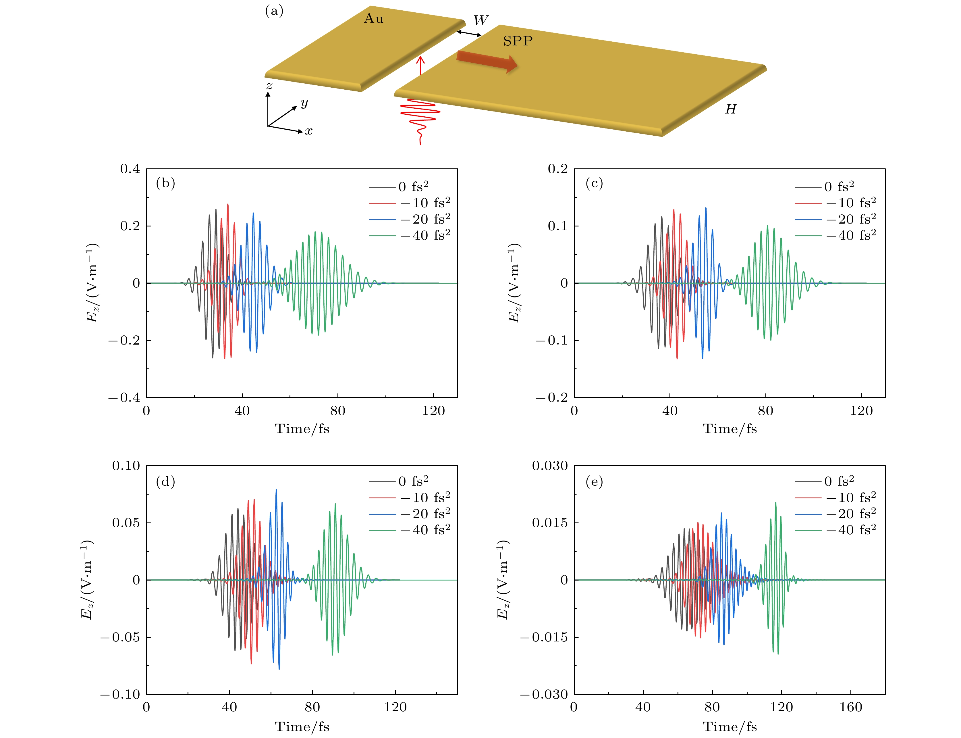 Figure 2. (a) Schematic diagram of the simulation setup, W = 350 nm, H = 10 nm; temporal evolution of electric field of SPP with the propagation distances of 1 μm (b), 2 μm (c), 3 μm (d), 6 μm (e) under the excitation of femtosecond laser pulse with the negative dispersion of 0 (black), –10 (red), -20 (blue), –40 fs2 (green), respectively.