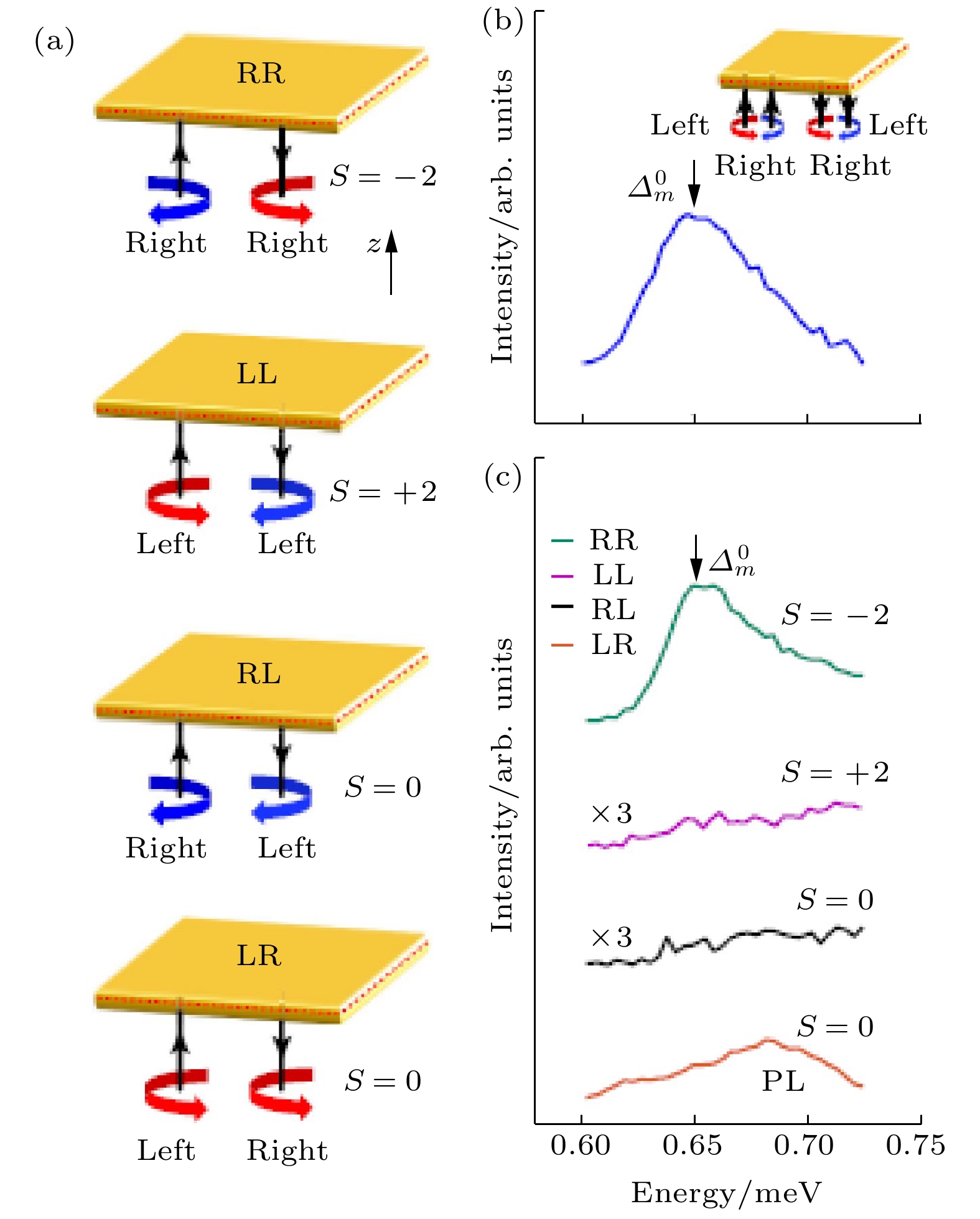 图 3  圆极化偏振的拉曼散射, 不同入射光与出射光偏振的组合对应于系统不同角动量的元激发, 在1/3填充的Laughlin态中, 只有对应于角动量为–2的组合有共振峰(见右图绿色曲线), 与文献[10]的预言相符, 引自文献[12]