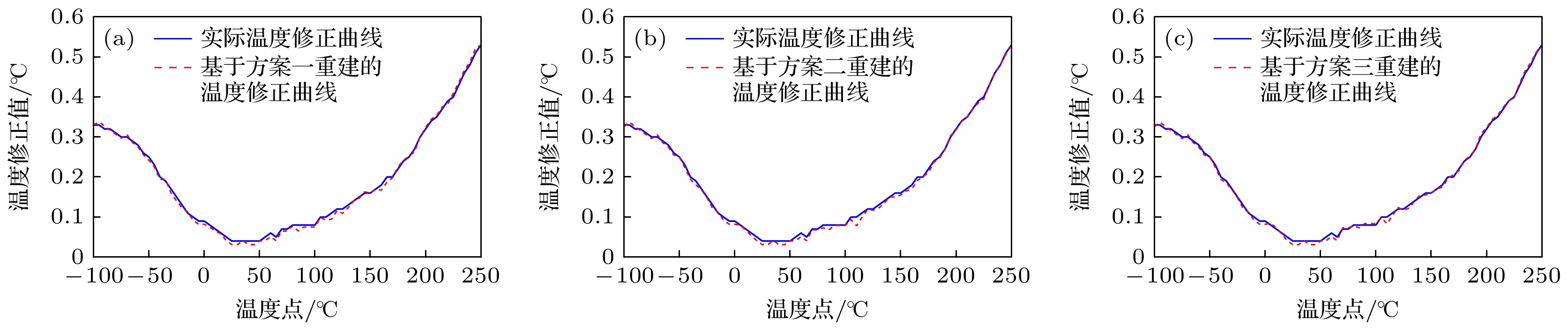 为进一步验证本文所提算法具有更好的普适性和灵活性, 通过选取不同的特征温度点组合进行实验验证. 特征温度点的选取在表3列出, 方案一通过包含量程上下限的同时, 在量程范围内尽可能等分选取; 方案二通过从量程下限向上均匀选取, 但不包含量程上限; 方案三根据温度修正曲线变化规律, 将曲线划分为多个变化平缓的非线性分段, 并将交接点作为特征温度点, 同时尽可能均匀选取. 基于方案一、方案二、方案三重建的温度修正曲线如图4(a)—(c)所示, 重建的温度修正曲线的RMSE值分别为0.0065, 0.0073, 0.0061. 可以看到方案三的RMSE值最优, 这是因为该方案特征温度点组合最大限度包含了温度修正曲线的特征, 建立的重建矩阵能更好地反映温度修正曲线的变化规律. 整体而言, 改变不同特征温度点组合虽然对重建的温度修正曲线有一定的影响, 但整体变化不大. 这说明该算法具有良好的普适性, 不必根据温度修正曲线的变化而选取特征温度点组合, 只需对温度量程尽可能进行均匀划分选取, 便能得到良好的修正效果, 这极大提高了修正效率.