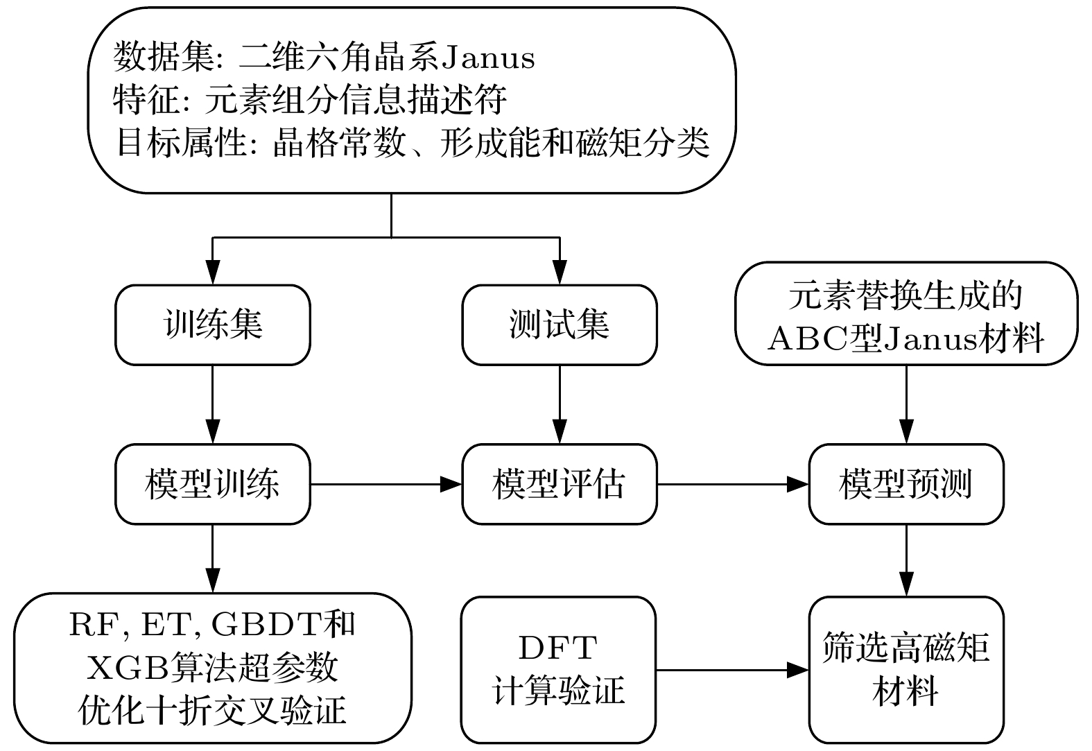 本文基于材料的元素组分信息, 训练了四种针对六角晶系ABC型Janus结构的机器学习模型. 用于预测Janus材料的晶格常数、形成能和磁矩分类. 通过模型的高通量筛选, 发现了4024种未被探索的高磁矩六角晶系Janus材料. 最后, 基于第一性原理的计算, 进一步验证了模型筛选的可靠性, 为未来实验上制备上述高磁矩的Janus材料提供了理论依据. 工作流程如图1所示.