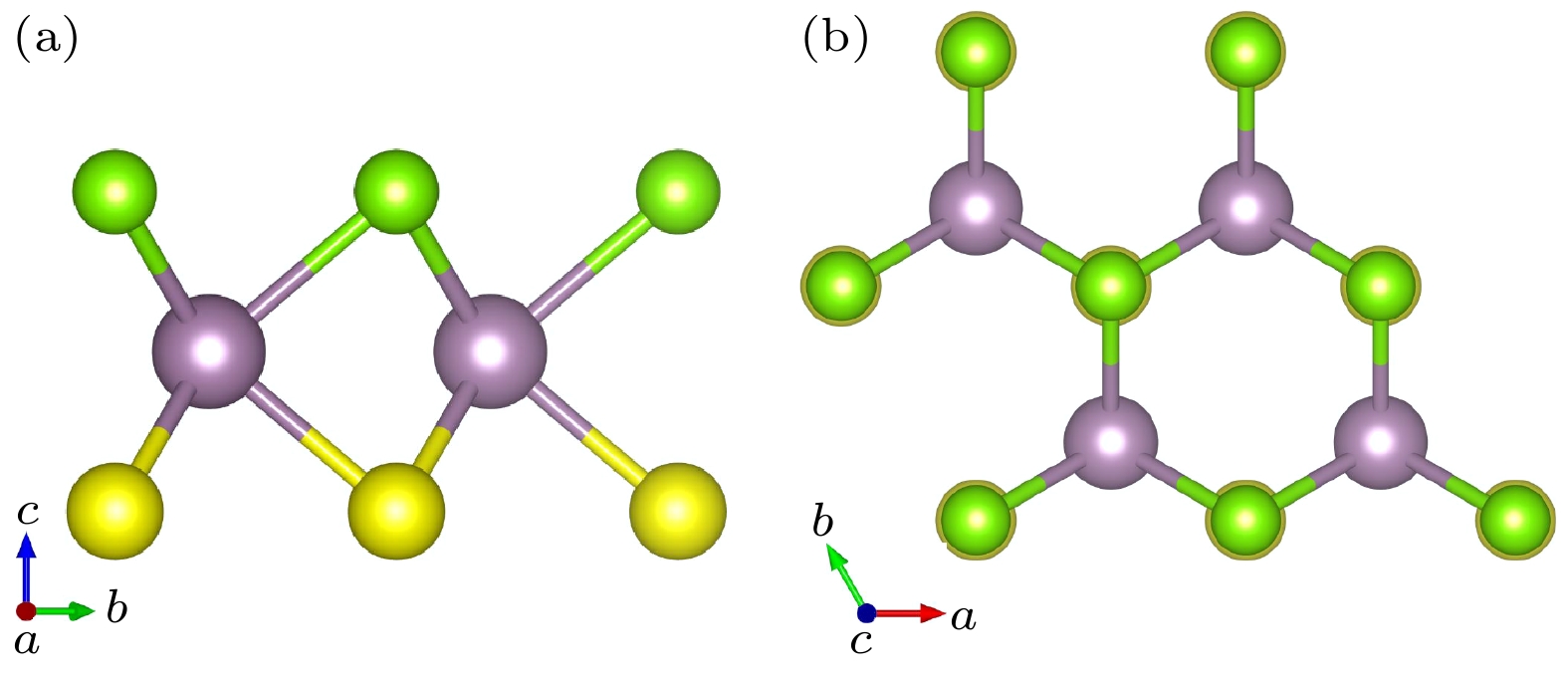 图 2  六角晶系ABC型Janus材料原子结构的(a)侧视图和(b)俯视图