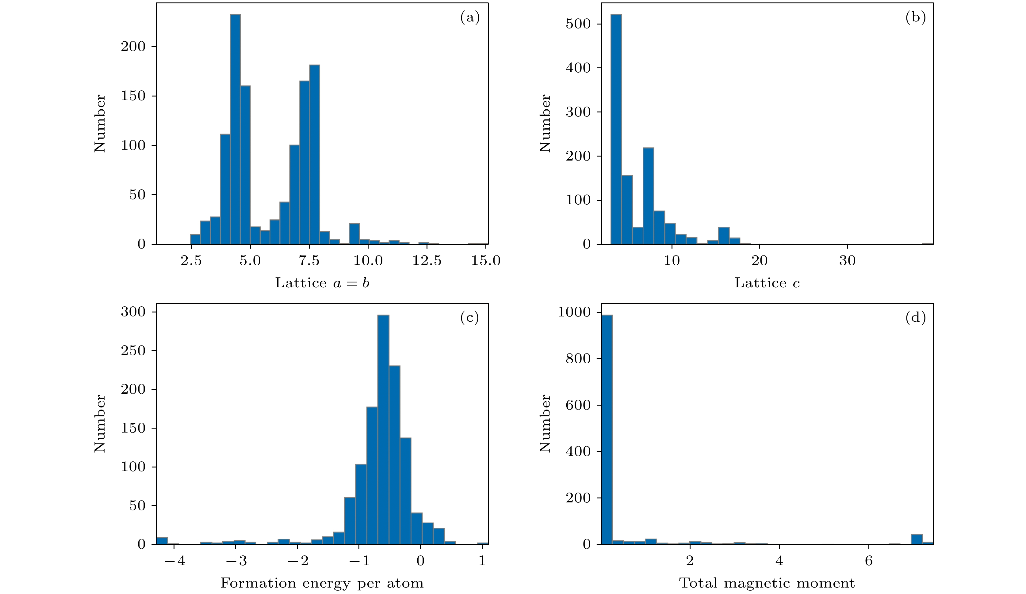 图3展示了数据集中二维Janus结构数量随晶格常数、形成能及总磁矩变化的分布情况. 图3(a)显示, 数据集中Janus结构的晶格常数a, b的分布主要在4 Å和8 Å附近, 具有两个显著峰值, 表明数据集中面内晶格较为集中. 图3(b)显示晶格常数c主要分布在3—10 Å的范围内, 在3—7 Å处具有显著峰值, 而少数二维Janus结构的c值大于10 Å, 这可能是模型中考虑了真空层的厚度所导致[32]. 图3(c)显示大部分Janus结构的形成能低于0 eV, 表明上述结构是热稳定的, 仅小部分是不稳定的. 图3(d)显示大部分材料的总磁矩主要集中在0—$ 0.25\mu_{\mathrm{B}} $的狭窄区间, 只有少数具有较高的磁矩. 上述特征表明, 数据集中的大部分Janus结构是热稳定的, 且具有较低的磁矩. 以上数据集中目标属性的特征对于机器学习算法的选择、超参数调试具有重要作用.