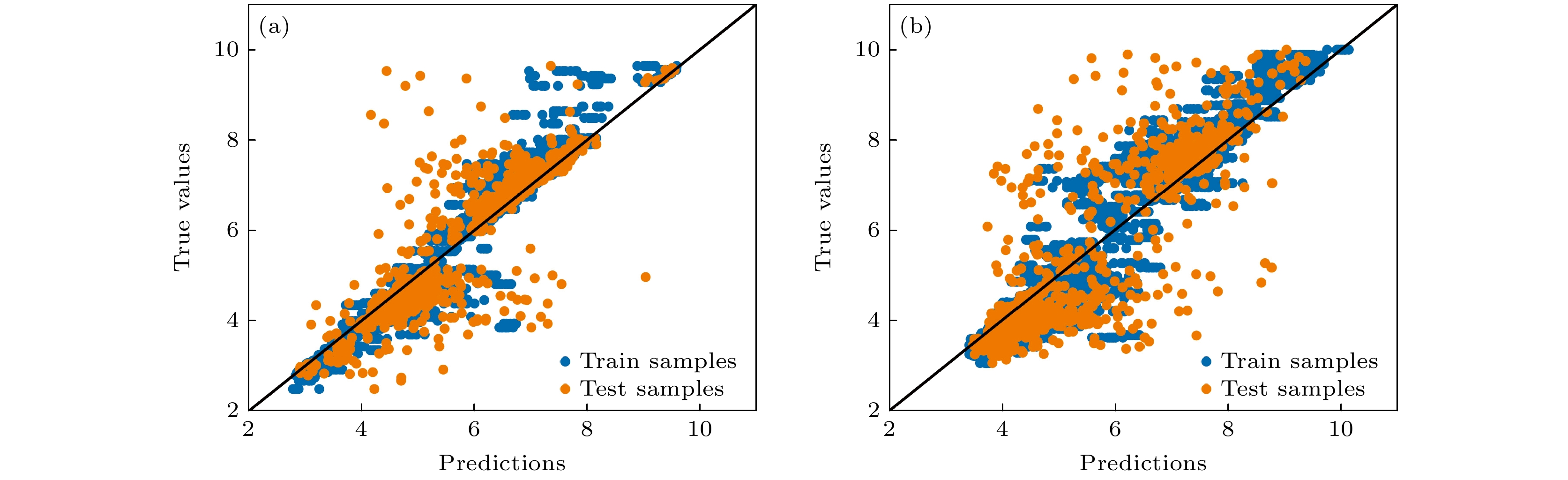 图 4  晶格常数预测: 最优模型在十折交叉验证中的散点图 (a) Lattice a = b预测任务最优模型: 极端随机树; (b) Lattice c预测任务最优模型: 极端梯度提升