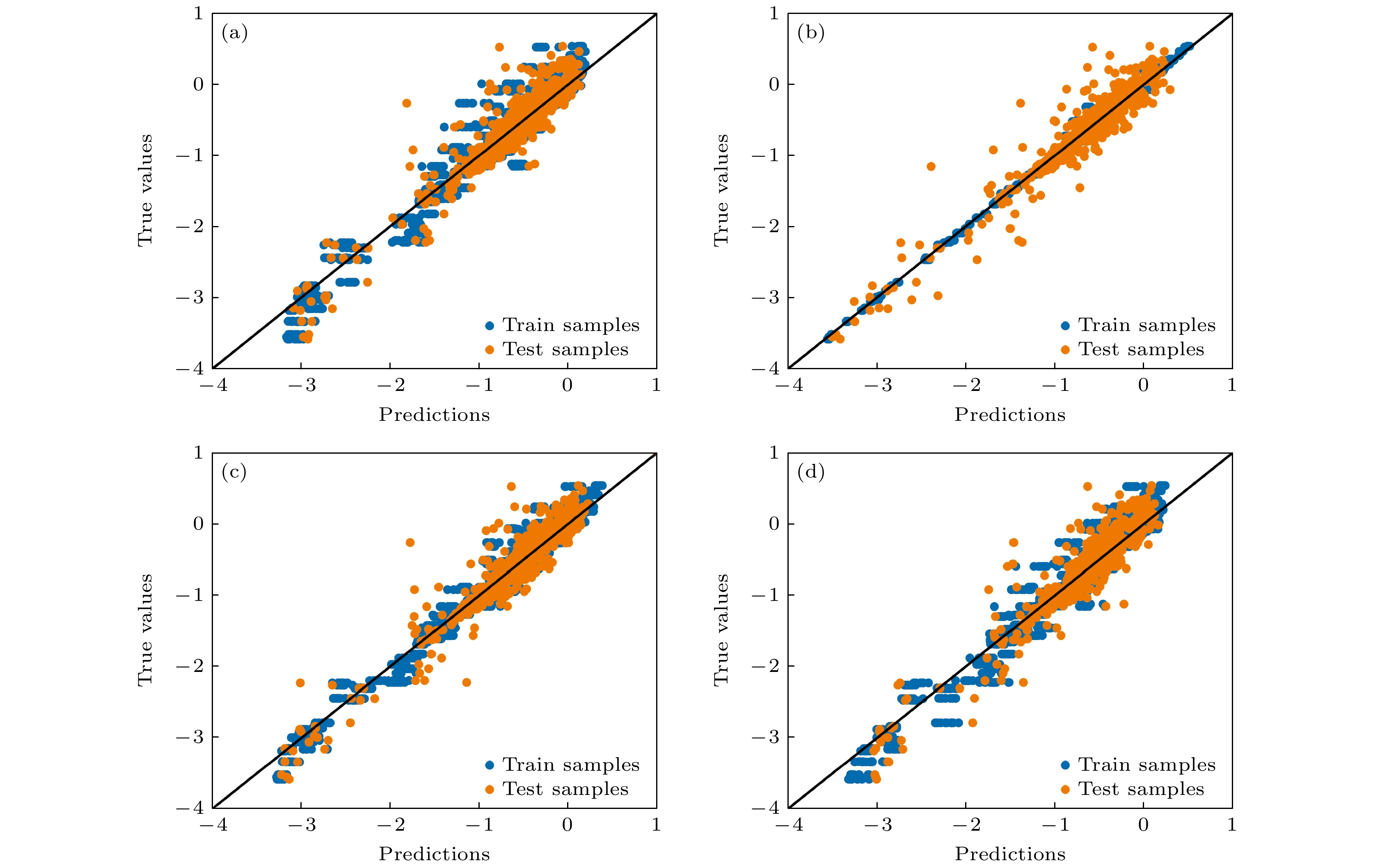 Figure 5.  Prediction of formation energy: Scatter plots for four models in ten-fold cross-validation: (a) RF; (b) GBDT; (c) XGB; (d) ET