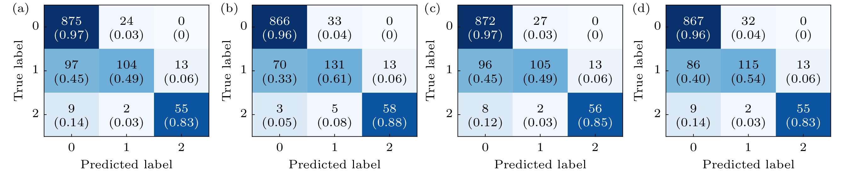 • 为了评估磁矩分类模型的性能, 对四种模型进行了十折交叉验证, 并使用宏平均(macro-averaging)方式对每个类别单独计算评价指标, 然后对所有类别的结果取平均, 以确保每个类别的表现都得到公平的评估. 这种方法在类别不平衡的情况下, 能够对模型性能提供更加全面和真实的评价. 其在十折交叉验证过程中各模型在测试集上的平均评估指标如表4所列. 图6(a)(d)直观展示了各模型在十折交叉验证过程中所有预测值和真实值的混淆矩阵图.