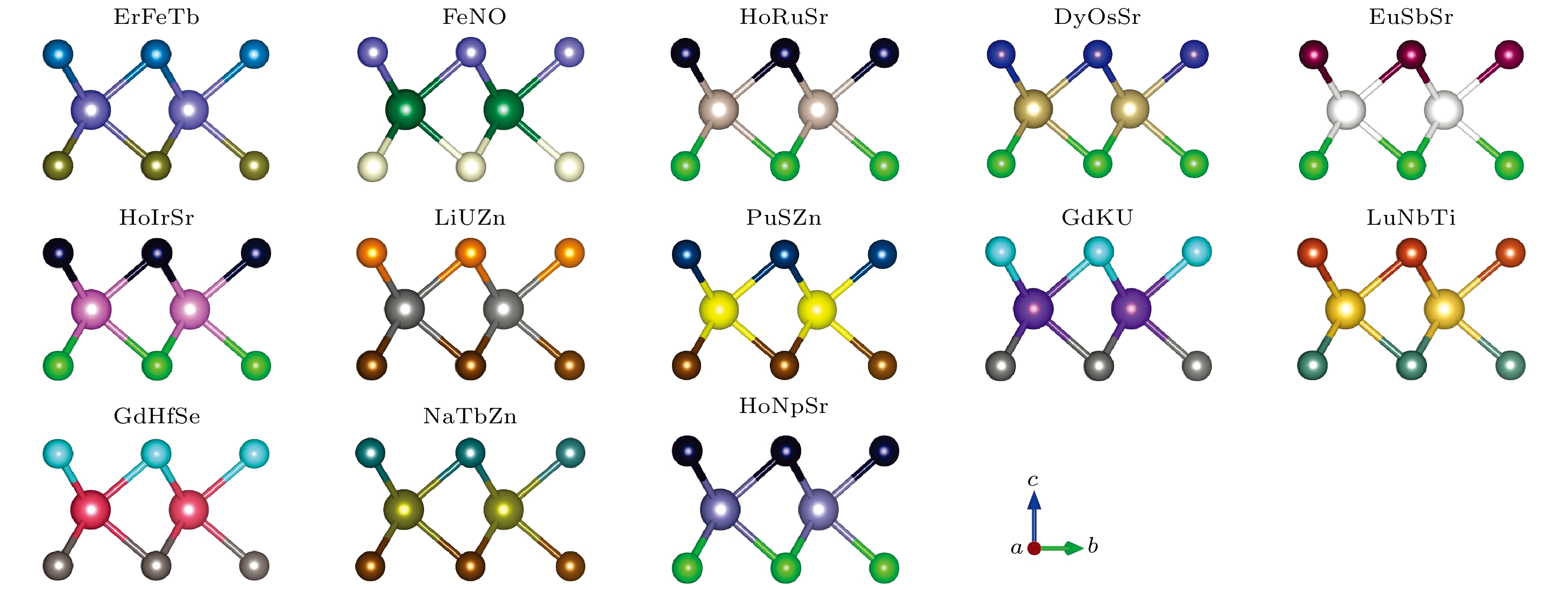 将上述各部分评价性能最好的模型用于预测82018种二维六角晶系Janus材料的晶格常数、形成能和磁矩. 模型共预测出4204种包含晶格信息并具有热稳定和高磁矩的结构. 为了进一步验证其可靠性, 本文从高通量筛选结果中随机挑选了13种涵盖了不同元素的二维Janus结构并结合第一性原理的研究, 计算其晶格常数、形成能和磁矩. 图7分别为ErFeTb, FeNO, HoRuSr, DyOsSr, EuSbSr, HoIrSr, LiUZn, PuSZn, GdKU, LuNbTi, GdHfSe, NaTbZn及HoNpSr共13种二维Janus原子结构的侧视图. 优化后的晶格常数、形成能和磁矩如表5所列. 补充材料表S1 (online)给出了13种未优化结构的形成能和磁矩.